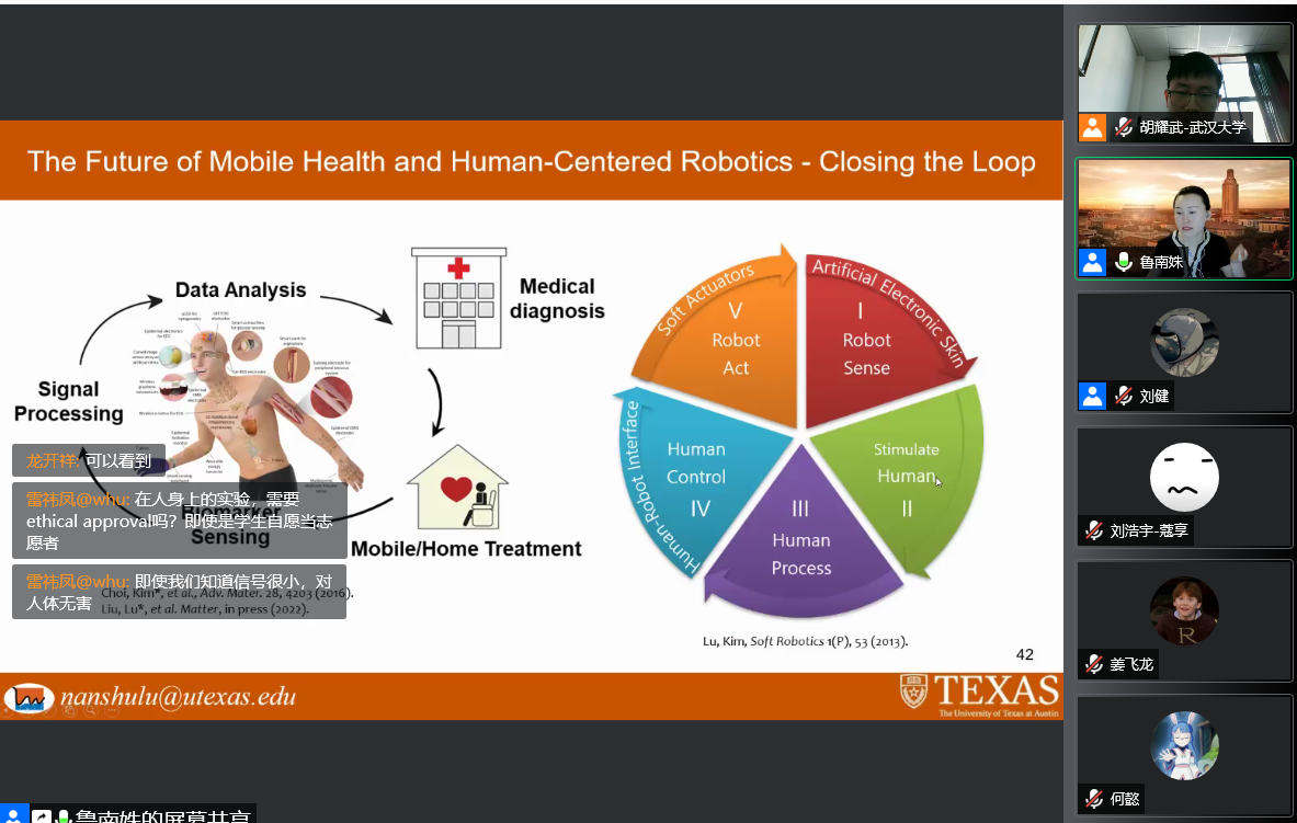 本网讯(通讯员:尚瑨 编辑:陈飏 审核:胡耀武、刘泽庭)3月7日中午,美国德州大学奥斯汀分校力学/机械等院系教授鲁南姝在巴卡漫画 通过线上会议的形式,举行“用于人体数字化和智能仿生机器人的生物电子元件”学术研讨会,学院副院长胡耀武及部分师生参加了本次研讨会,本次研讨会由胡耀武主持。