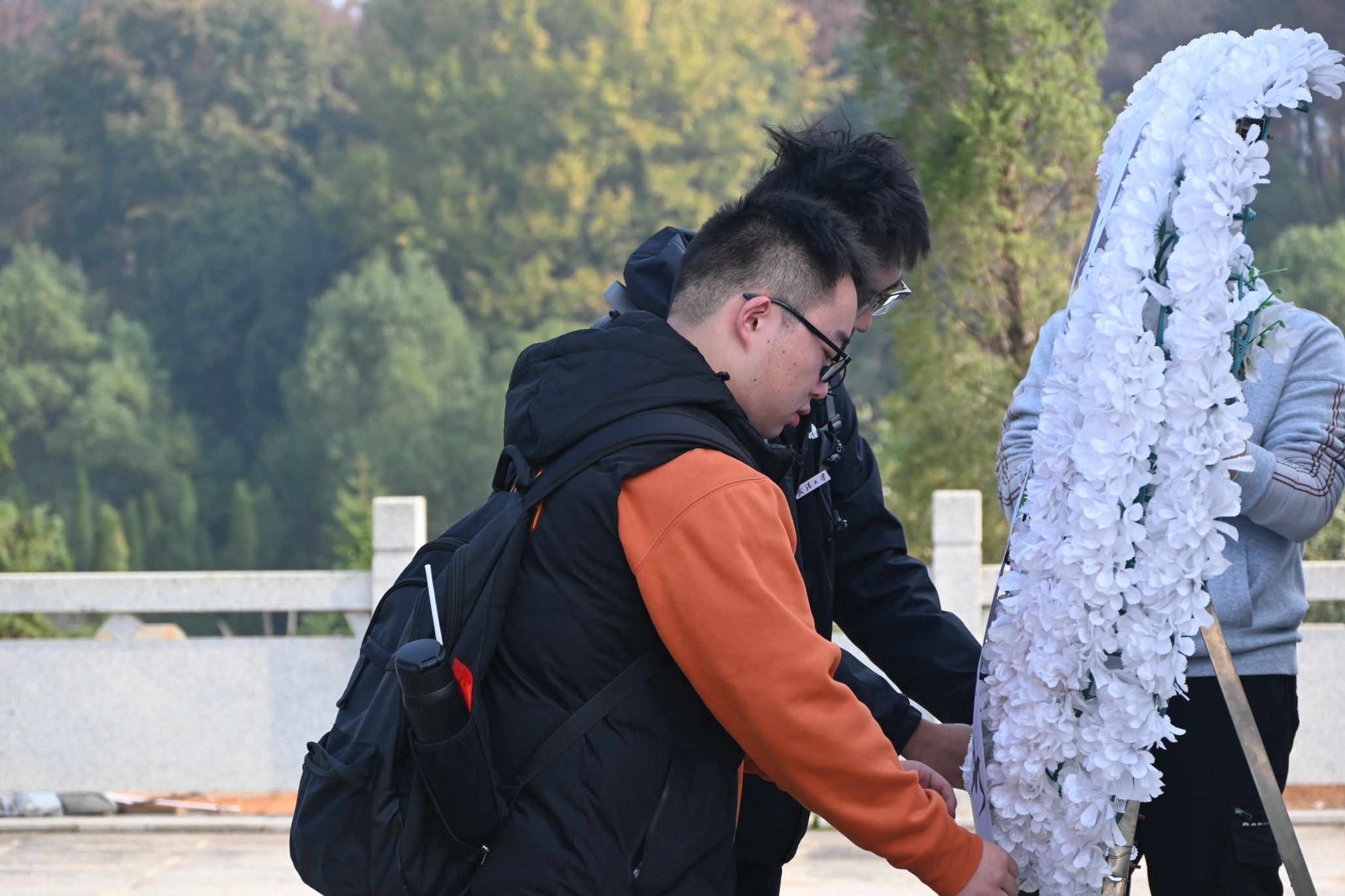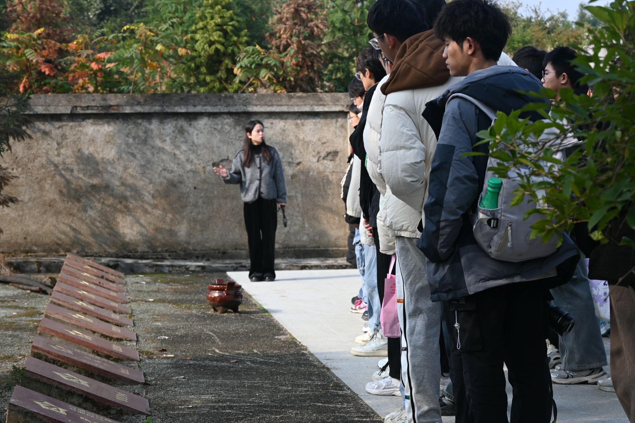 上午七点三十分,学院师生从学校出发,首站抵达的是龙港红军烈士陵园。这里庄严肃穆,松柏苍翠,一座座烈士墓碑静静地诉说着那段烽火连天的岁月。团学骨干们整齐列队,向烈士纪念碑敬献花篮,默哀致敬,表达对革命先烈的无限敬仰和深切缅怀。在革命烈士纪念碑下,全体党员向革命先烈默哀鞠躬,并庄严重温入党誓词。烈士墓碑排列整齐、巍然耸立,墓碑上描金的党徽在阳光下灿烂夺目。尽管绝大多数的烈士墓碑没有名字,仅用编号标记,但革命先烈忠诚、勇敢、热血、无畏牺牲的精神永远是激励当代青年们奋勇前行的强大力量。
