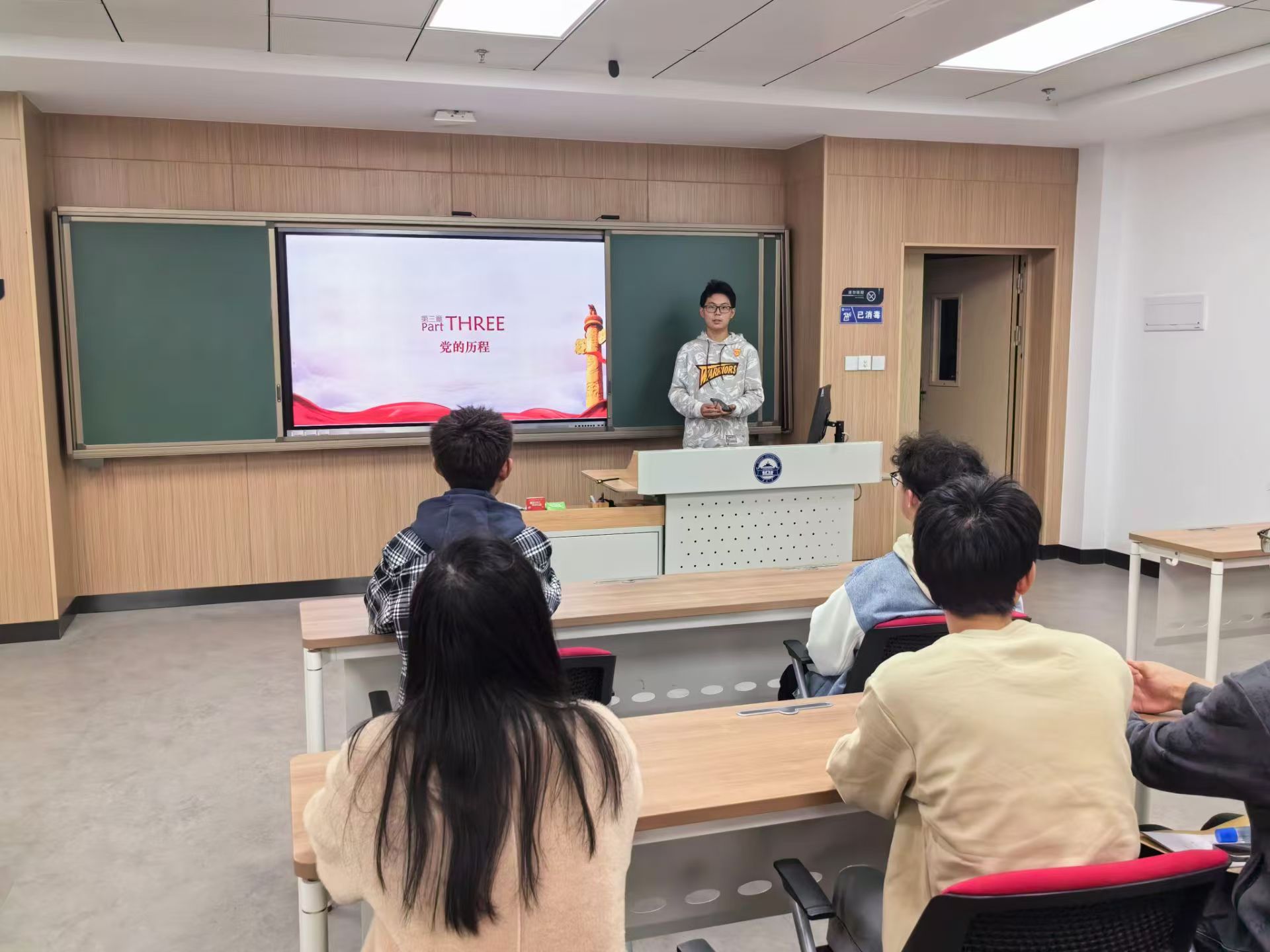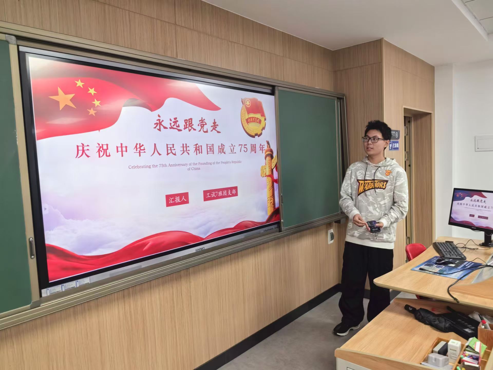 然后赵家晟同学进行第二部分“庆祝中华人民共和国成立75周年”主题讲解。会议中,赵家晟同学以新中国的发展历史为线,详细展示了75年来中国人民在中国共产党坚强领导下,团结拼搏,艰苦奋斗,实现了国家从积贫积弱到繁荣富强的伟大转变,着重强调了中国共产党在中华人民共和国的建设过程中所发挥的中流砥柱作用,教育全体团员中国共产党领导是中国特色社会主义制度的最大优势,并在同时指出当代青年应当弘扬团结拼搏,艰苦奋斗的优良传统,在全面建成社会主义现代化强国的拼搏路上再创辉煌。