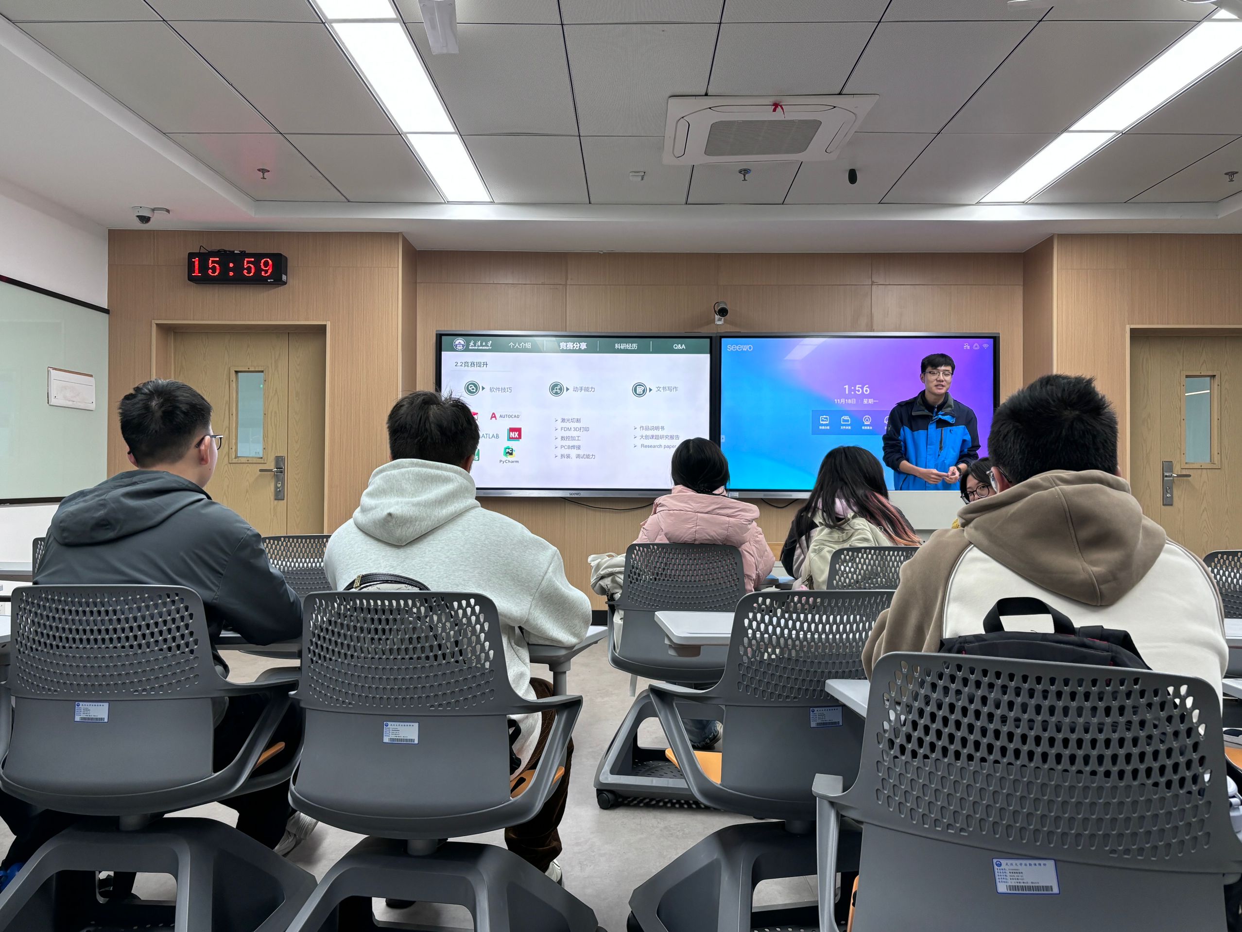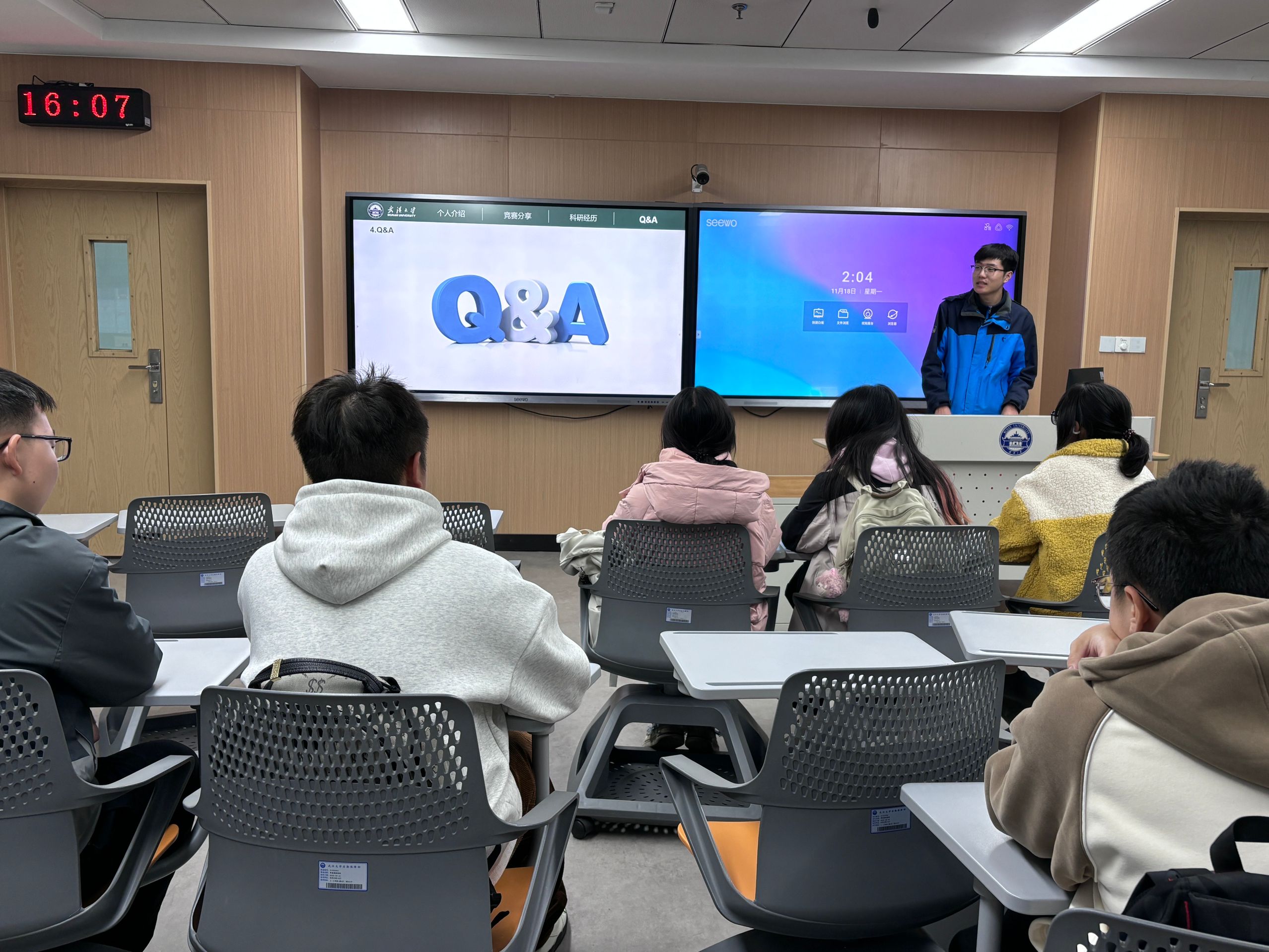 活动最后,熊欣瑶请来了21级史少楠进行学习经验交流。在本次分享会上,他首先介绍了学习经验,包括课程重点把握和高效学习方法运用。随后是竞赛分享,讲述赛场中团队协作和攻坚克难历程,让大家认识到竞赛对提升专业能力的作用。最后,他分享了科研经验,包括课题选择、研究创新思维和困难应对方法。在问答环节,团员青年们踊跃提出疑问,史少楠也热心解答了他们的问题。此次分享为团员青年们开启了科研新大门,也激发了他们勇于探索未知领域的信心。