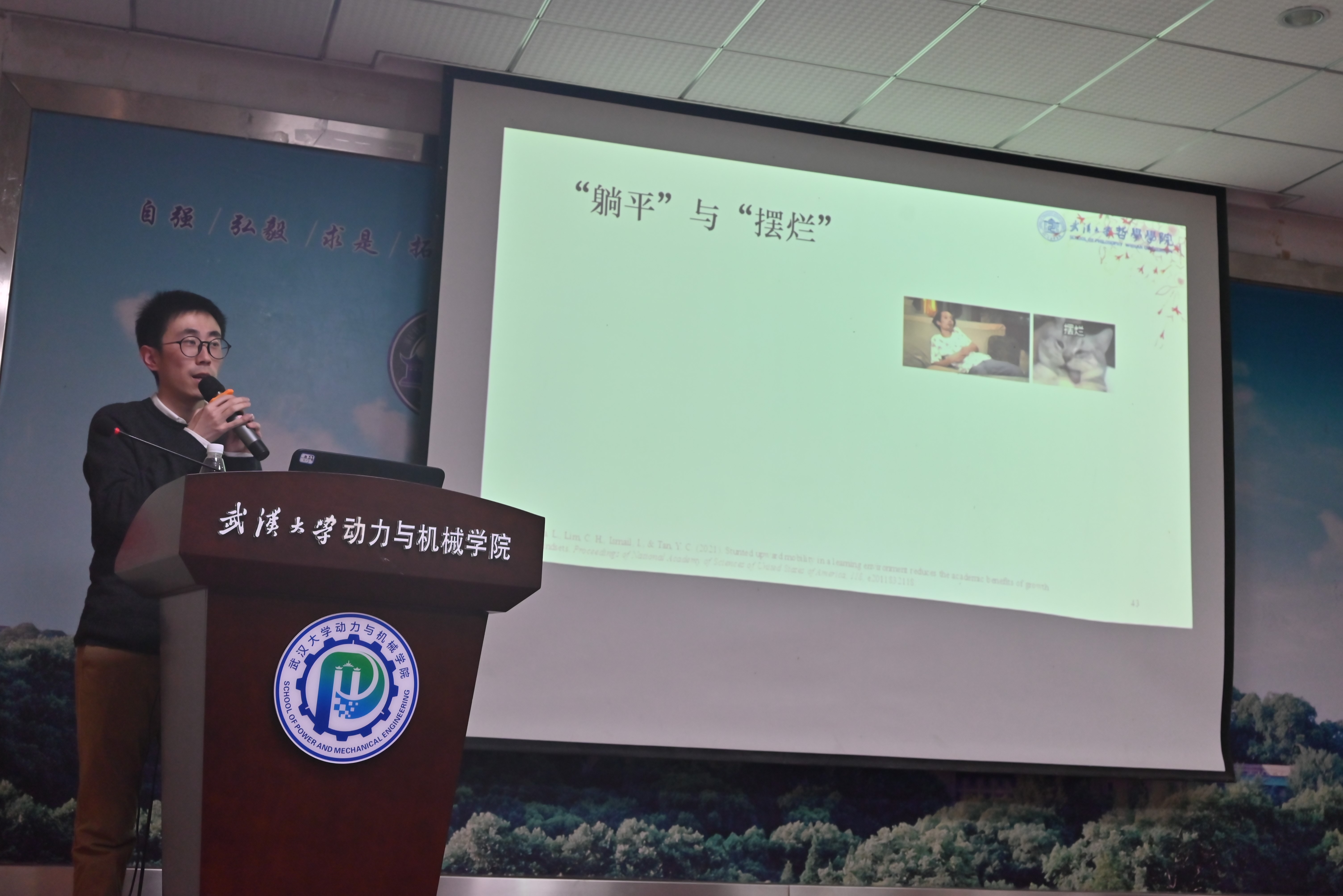 讲座伊始,尉兆梁指出情绪是进化的产物,会附带一些特定的行为认知和结果,接着从生活中的消极情绪、积极情绪以及情绪的应对方法逐一展开介绍。他指出,消极情绪可以帮助我们应对环境中存在的挑战和潜在的威胁,让我们得以生存,积极情绪可以帮助我们发现生活中的美好和机遇,让我们活得更好,“二八原则”——20%的消极情绪和80%的积极情绪是衡量一个人心理将康与否的标准。随后尉兆梁从情绪产生的“ABC”理论分别介绍了情境关注策略、认知关注策略、反应关注策略。最后,他分析了导致“躺平”与“摆烂”情绪的固定性思维,提出积极的成长性思维才能更好的调节情绪,更好的面对日常生活中遇到的挑战和机遇。讲座后的交流环节中,针对老师和同学们在科研中遇到的问题,尉兆梁结合自己的求学和教学经历提出了多种情绪调节的好方法,让大家获益颇丰。