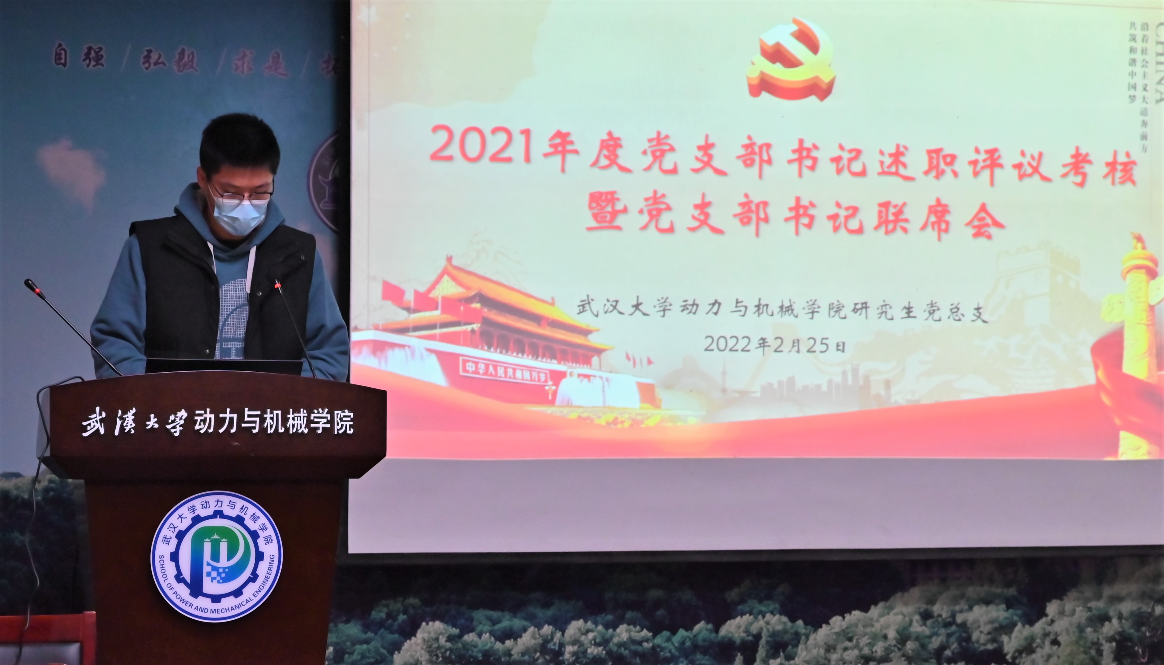 会议首先由各党支部书记按抽签顺序依次进行述职。各研究生党支部书记围绕党史学习教育、支部组织机制、“三会一课”和主题党日活动等方面依次开展汇报,详细介绍了各党支部在2021年度党建工作中取得的优秀成果与支部特色成果。与会老师及学生党员代表依据支部建设情况和述职表现进行评议打分。