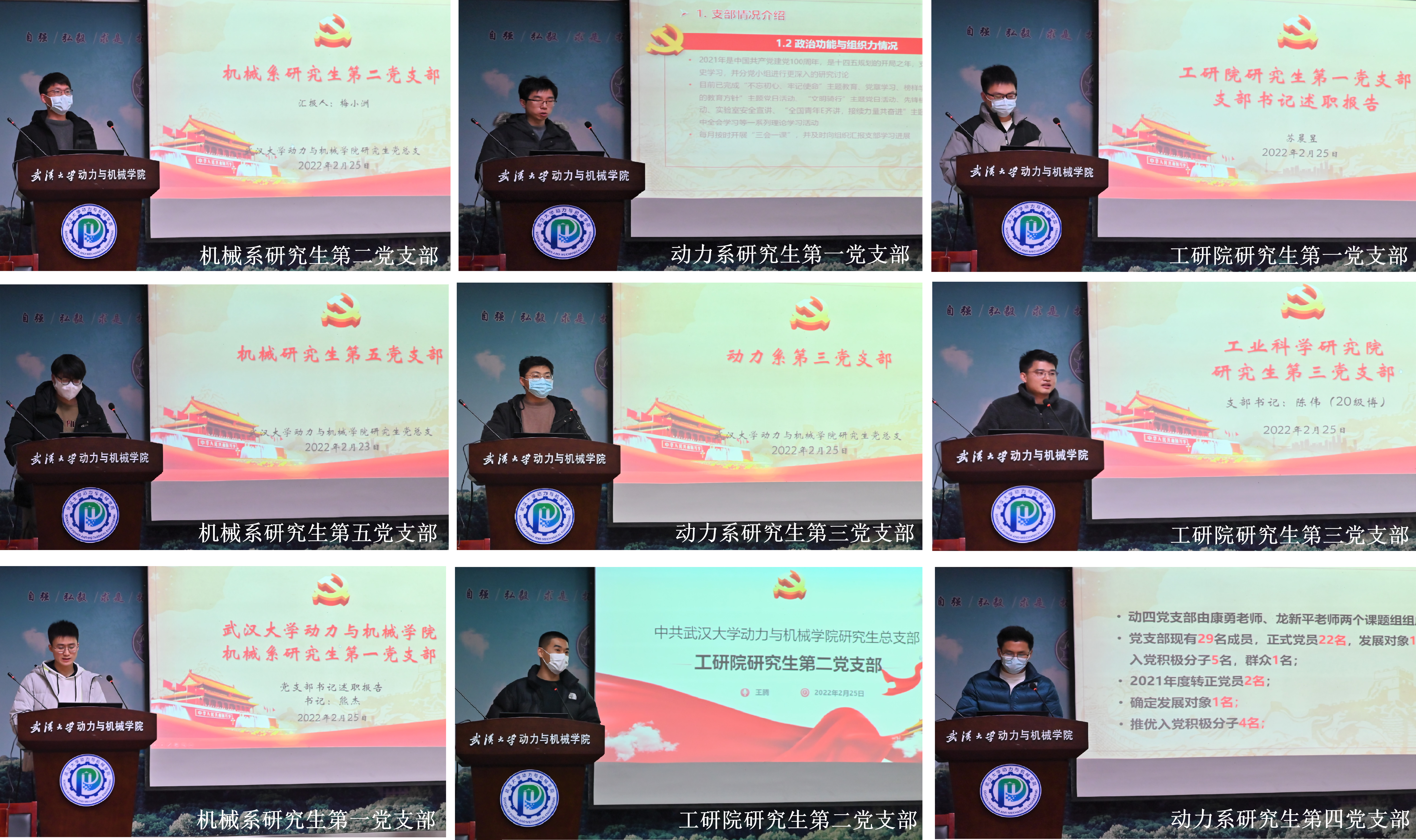 机械系研究生第二党支部书记梅小洲介绍了支部日常组织的“我为群众办实事”——论文撰写与投稿技巧分享会和公务员备考经验分享会,从支部成员们的科研工作主业出发,切实解决大家的问题和困扰;动力系研究生第一党支部书记庾泽华分享了未来的工作计划和措施,如需要进一步明确发展党员所需注意的时间节点等;工业科学研究院研究生第一党支部书记苏晨昱介绍了月度主题党课制度,由资深党员带领支部成员一起学习时事主题;机械系研究生第五党支部书记唐飞然分享了支部的扁平化管理模式,将支委分布于四个实验室之中,以解决支部实验室分布较为分散的问题;动力系研究生第三党支部书记杨喆皓介绍了支部合并和人员调整后,支部施行的线上线下双轨会议制度,大幅提高了会议效率及参会率;工业科学研究院研究生第三党支部书记陈伟讲述了落实党支部标准化、规范化建设情况,坚持做好“三会一课”制度;机械系研究生第一党支部书记熊杰分享了支部的党员民主评分制度,将日常参会、参加活动情况量化积分作为评优及发展的参考指标;工业科学研究院研究生第二党支部书记王腾介绍了支部创建公众号专栏“百年党史周周学”,并积极参与到党史学习与专栏推文创作中;动力系研究生第四党支部书记潘海增介绍了支部基本情况和培养出的优秀个人。