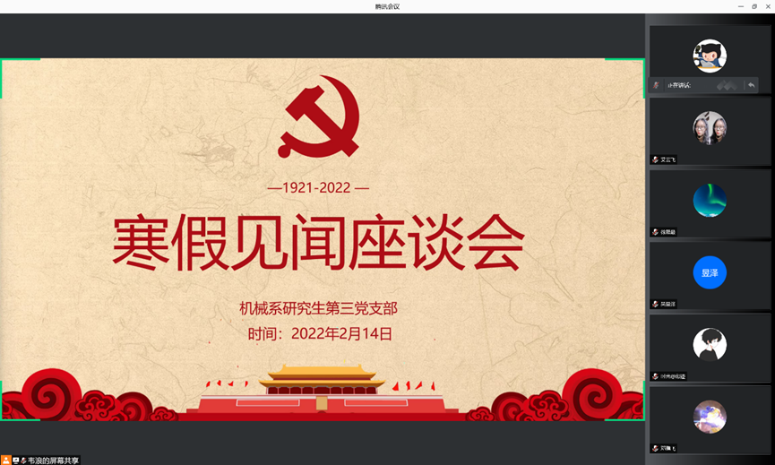 在座谈会上,同学们提及最多的是他们家乡的发展和变化。机械系研究生第五党支部的曾吉谈到自己家乡棉纺织业发展较好,自疫情以来提供了全国50%口罩为全国各地做出了巨大的贡献。材料系研究生第一党支部秦瀚钊谈到由于家乡是一个旅游城市,因此经济发展深受疫情影响,但是这次寒假回家,家乡的经济已经在慢慢复苏了,同时表达了疫情不再反复,生活逐渐变好的希冀。动力系研究生第四党支部的刘枫谈到自己家乡近些年的变化,通过社区网络平台积极开展政务公开,极大地方便了群众办事,但也对不习惯从平台获取信息的老年人造成了一定的困难。机械系研究生第一党支部的雷世界谈到了家乡的医疗水平的提升,以及便利的快递、外卖服务提升了居民的幸福感。动力系研究生第五党支部的陈盛提到县城的高铁站扩建,家乡也建起了台商小镇,拉近两岸关系,建设了乡村振兴示范带,人民的生活水平显著提高,为家乡的发展感到自豪。