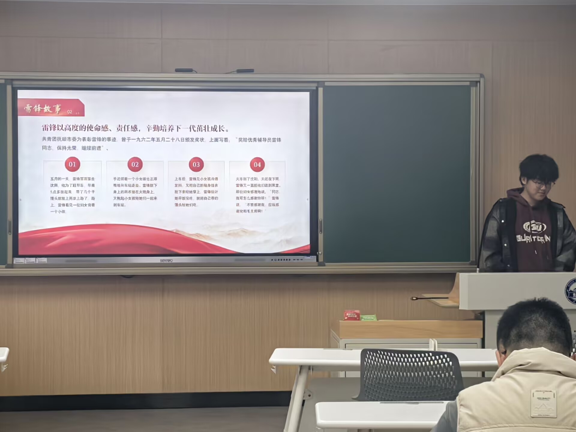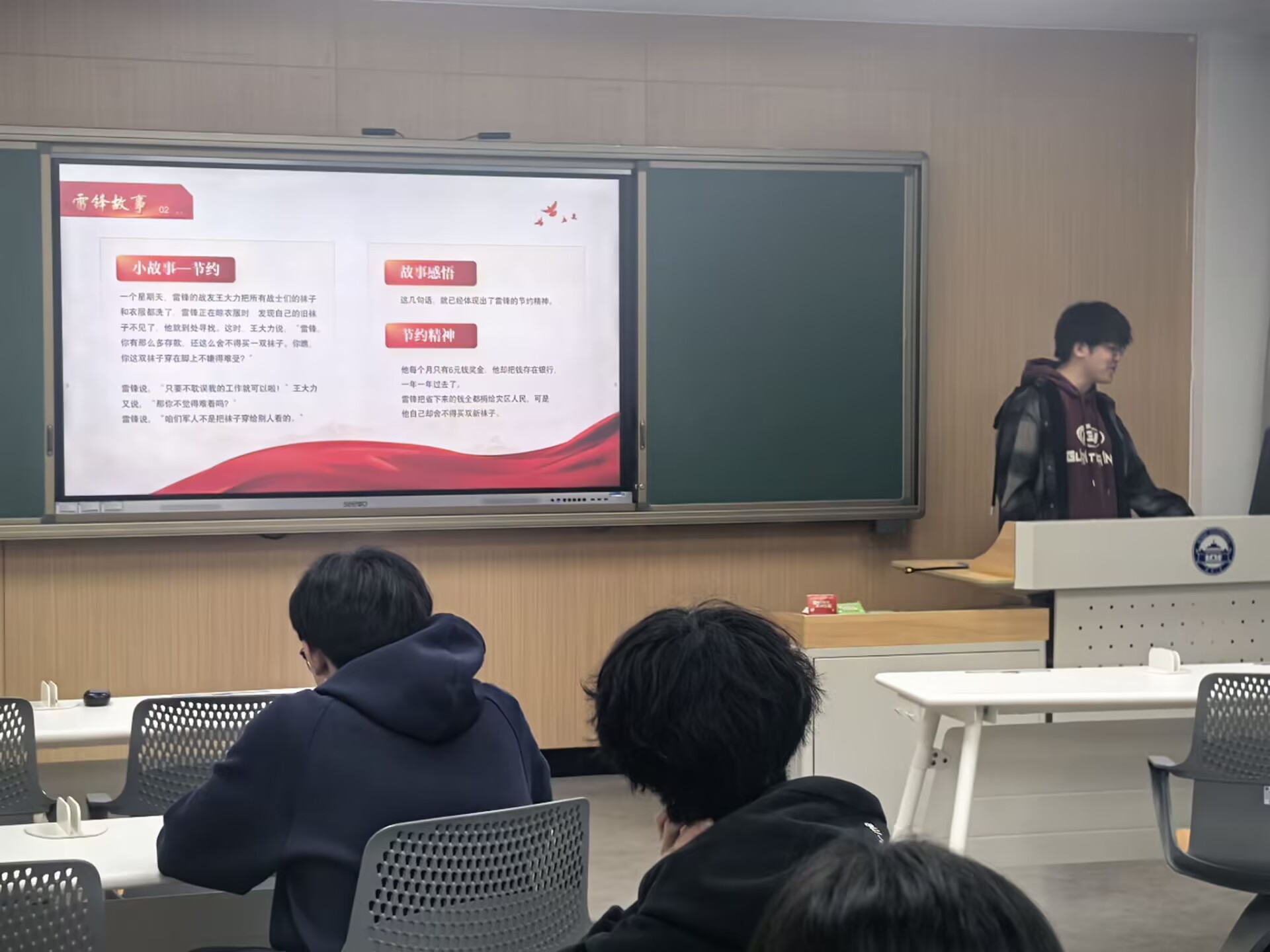 在第三部分,程天乐通过雷锋事迹阐释雷锋精神内涵。他以雷锋"补丁袜"等鲜活故事为切入点,生动展现了这位普通解放军战士克己奉公、无私奉献的品质。他重点讲述了1963年毛泽东主席题词"向雷锋同志学习"的历史意义,并说明雷锋精神已深度融入党团教育的核心价值体系。程天乐通过具象化的事例呈现,引导团员青年们将节约精神转化为日常行为自觉,实现崇高精神与生活实践的有机统一。此外,团员青年白景先还朗诵了雷锋名言,倡议团员青年们在艰苦斗争中锻炼自己,做永不生锈的螺丝钉。