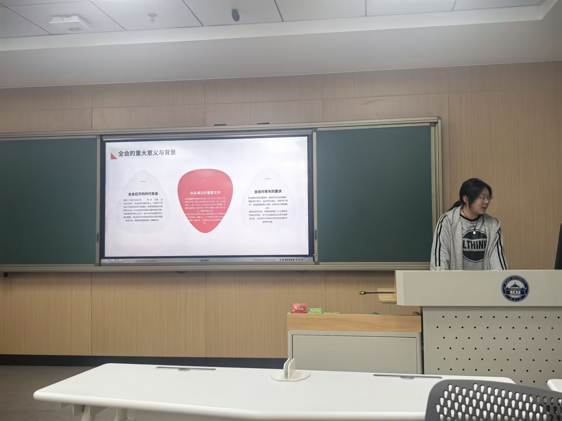 在第一部分,吴婉蓉带领团员青年们深入学习《中共中央关于进一步全面深化改革、推进中国式现代化的决定》,向团员青年们阐释该决定的重要意义。这一决定是党的十八届三中全会以来全面深化改革的实践延续,也是新征程推进中国式现代化的时代篇章,具有重大的历史意义。全会进一步明确全面深化改革的总目标为完善和发展中国特色社会主义制度,推进国家治理体系和治理能力现代化。这一目标体现了党对社会建设规律和国家治理规律的深刻理解。同时,她介绍到坚持以人民为中心、守正创新、以制度建设为主线等原则,都是对改革宝贵经验的科学总结。团员青年们认真聆听,深刻领会全会精神,纷纷表示要增强“四个意识”、坚定“四个自信”、做到“两个维护”,将思想和行动统一到党中央决策部署上来。