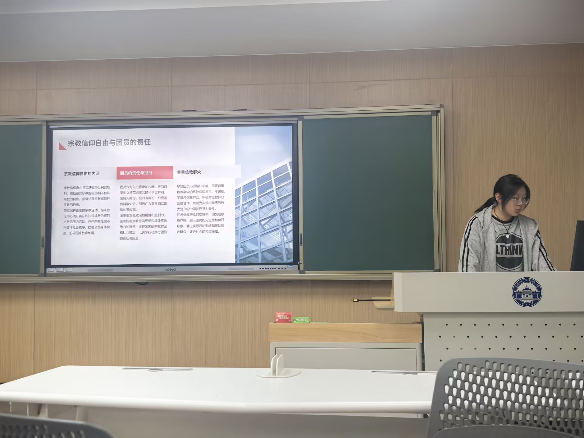 在第二部分专题教育中,吴婉蓉带领团员青年们深入学习了"团员不得信仰宗教"的核心要求。她结合《中国共产主义青年团章程》规定系统梳理了团员信仰宗教的三重危害:一是有悖共青团作为党的助手和后备军的政治属性,违背了马克思主义唯物史观的根本立场;二是不利于青年树立科学理性的思维方式,容易导致思想认识偏差;三是可能破坏团组织的先进性和纯洁性,影响基层团建实效。通过对比分析,她讲解道,共青团倡导的实践创新精神与宗教超自然崇拜存在本质差异,申明团员青年们必须坚守政治底线。在明确我国宪法保障公民宗教信仰自由的同时,她提醒团员青年们要严格区分普通信教群众与共青团员的政治责任,严格遵守"三个不得"纪律要求——不得参与宗教活动、不得传播宗教思想、不得在团内搞宗教渗透。最后,她号召团员青年们要当好"三个表率":做马克思主义世界观的学习表率,主动运用辩证唯物主义方法论指导实践;做科学精神的传播表率,在校园和社区开展科普志愿服务;做抵御渗透的先锋表率,增强政治鉴别力,坚决维护意识形态安全。该环节强化了团员青年们的政治自觉,让团员青年们从理论层面厘清信仰宗教与团员身份的冲突,筑牢无神论思想根基;实践层面明确需在尊重信教群众的同时,以科学精神和法治意识抵御宗教渗透。通过双重定位,既有利于保持团员青年们的思想先进性,又助力培育基层青年骨干力量,为维护意识形态安全构筑起青春防线。