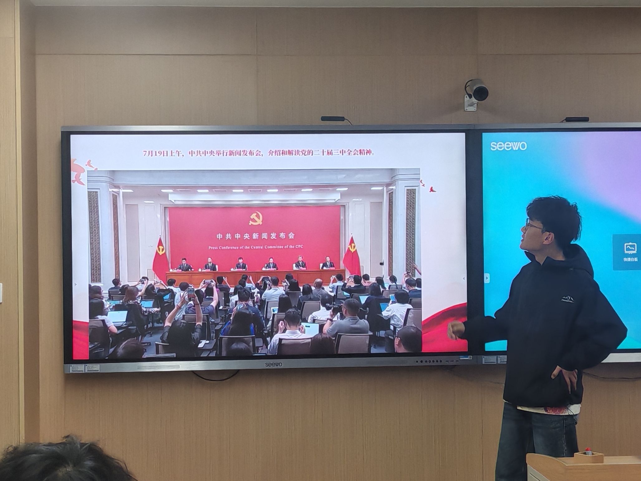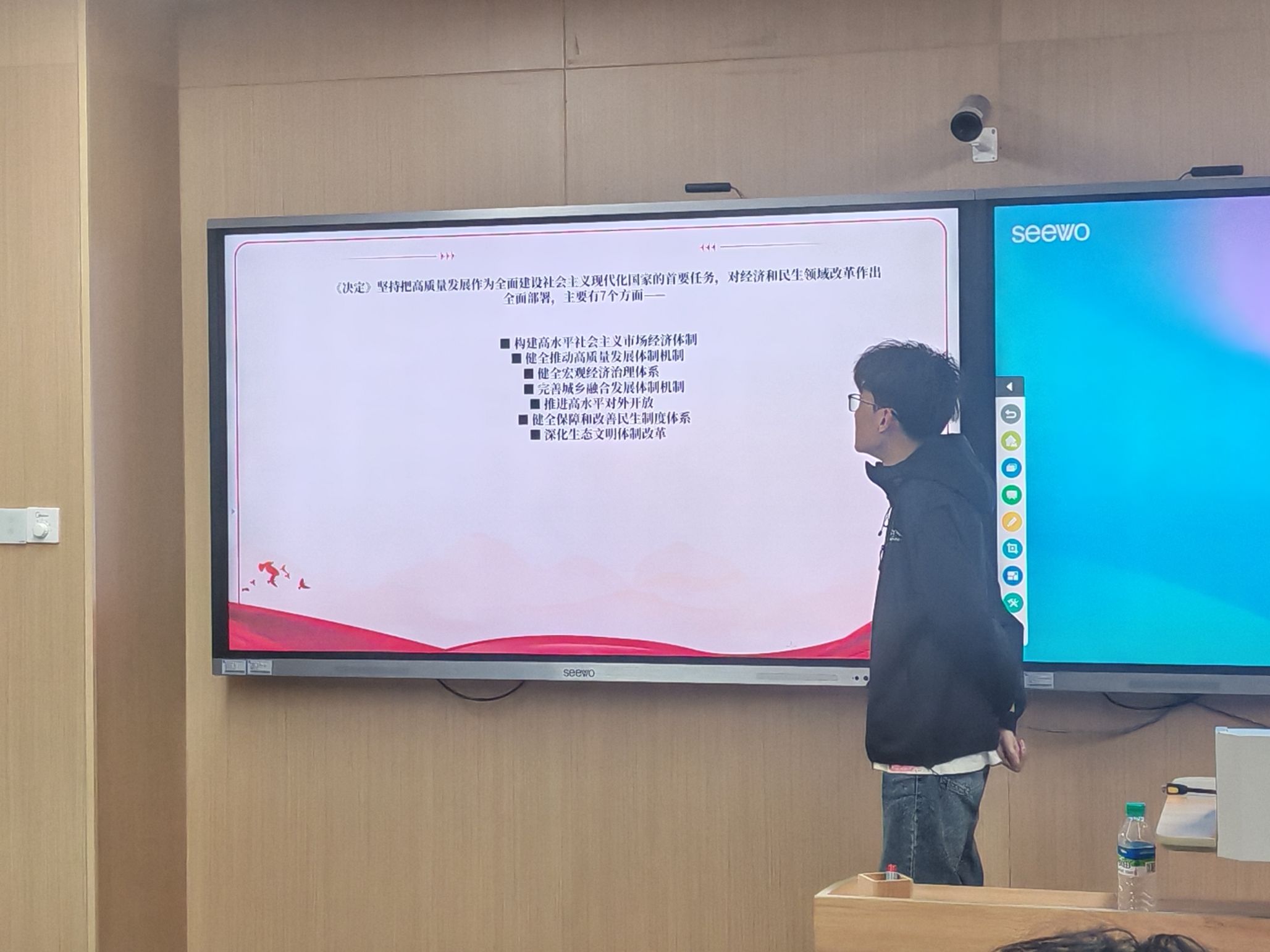 活动的第一部分,团支书栗振杰通过PPT展示和讲解带领大家学习党的二十届三中全会精神。中国共产党第二十届中央委员会第三次全体会议于2024年7月召开,全会审议通过的《中共中央关于进一步全面深化改革、推进中国式现代化的决定》意义重大。决定共15部分、60条,提出300多项重要改革举措,涵盖了体制、机制、制度等各个层面,为进一步全面深化改革明确了目标导向。