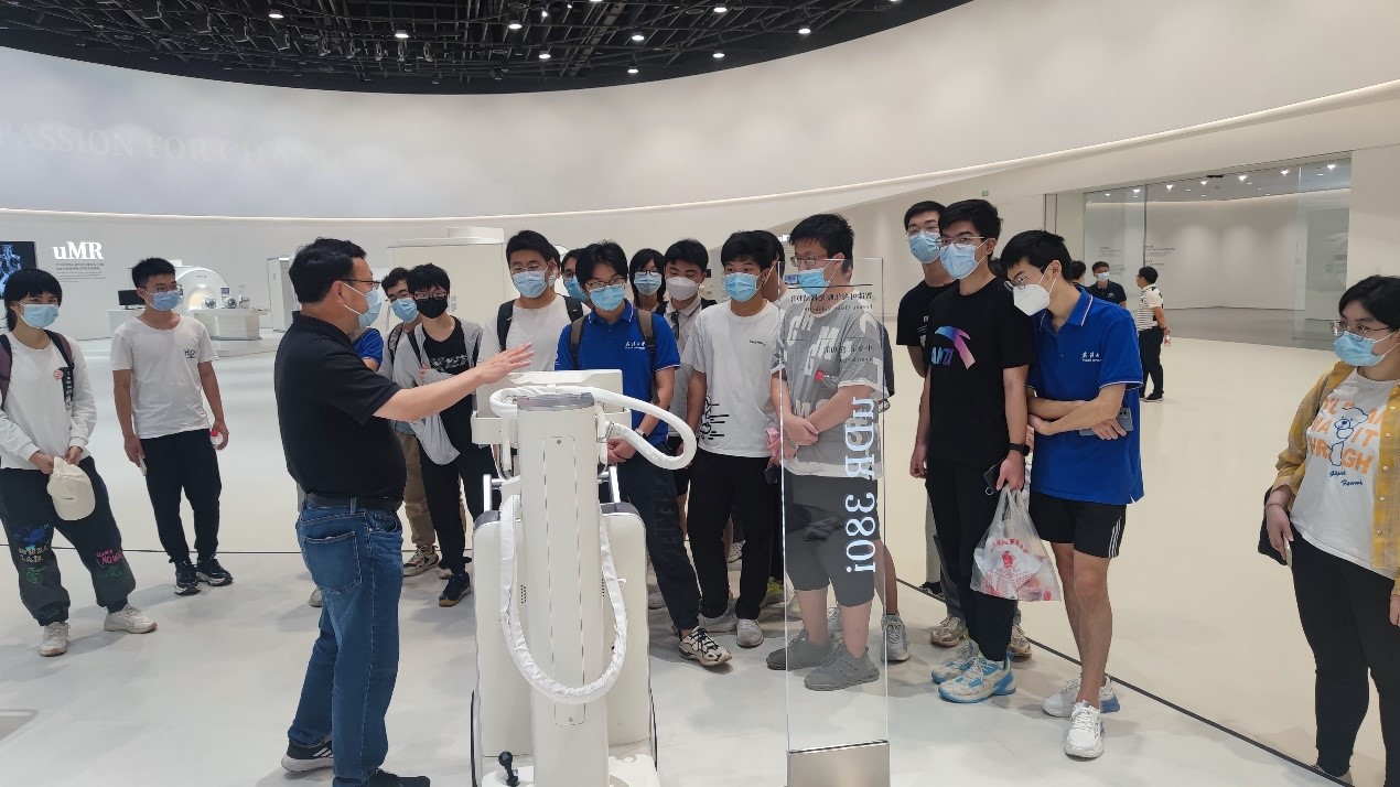 在同学们顺利到达后,联影公司的工作人员为同学们讲解放置于展厅的一系列高端仪器,如3.0T探索核磁共振、Pet CT等等,全方面地开阔了同学们的眼界,也点燃了他们心中投身于科研、研制高端科技设备的梦想火苗。
