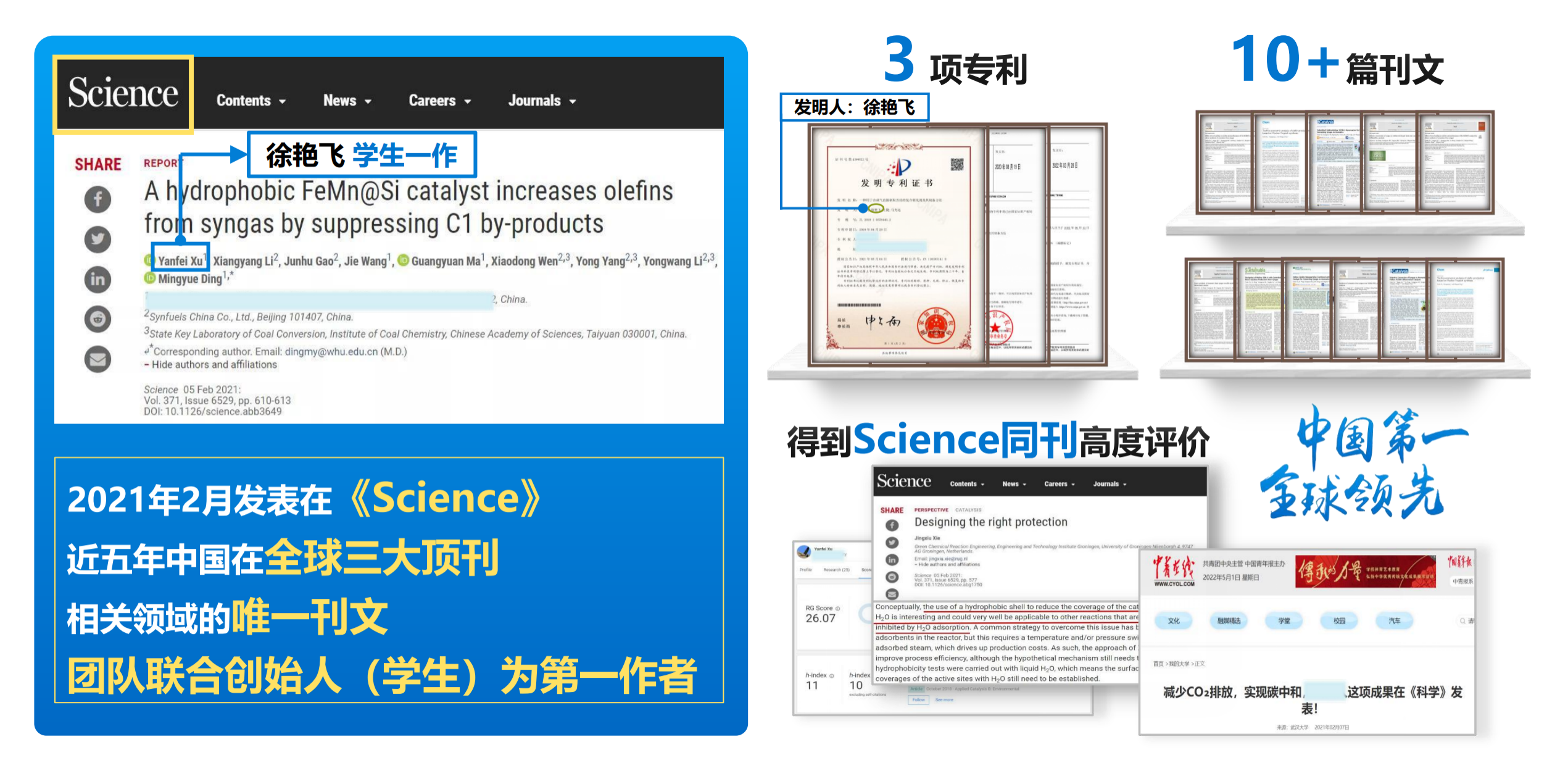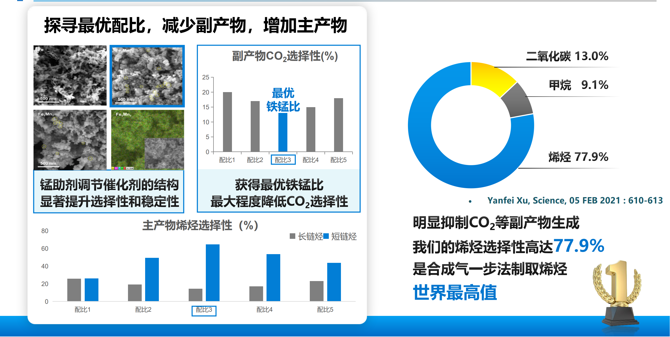 为积极响应国家“双碳”战略、推动工业领域绿色低碳发展、稳妥有序发展现代煤化工,零碳催化”项目以FeMn@Si-c催化剂为核心,通过减少催化过程中的碳排放,致力于开创我国煤化工行业“碳中和”新时代。FeMn@Si-c催化剂可以高效降低费-托(F-T)合成反应过程中副反应物二氧化碳、甲烷等单碳分子的排放,将二氧化碳和甲烷的总选择性抑制到22.5%以下;同时极大幅度增高了合成气制烯烃的产率,在一氧化碳转化率为56.1%时,烯烃的产率可达36.6%。