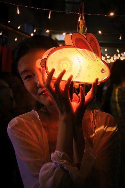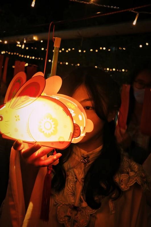 在入口的不远处,有美丽而浪漫的拍照打卡点,身着汉服的女孩子们在树下拍照,翩翩身影恍惚如嫦娥一般,令不少路人驻足观看。台阶上的小型演唱会也吸引了一批又一批听众,用歌声装饰着中秋的夜晚。惊喜与惋惜交织的投壶与拼点游戏也如火如荼地进行着,使得这个中秋之夜更加热闹起来。