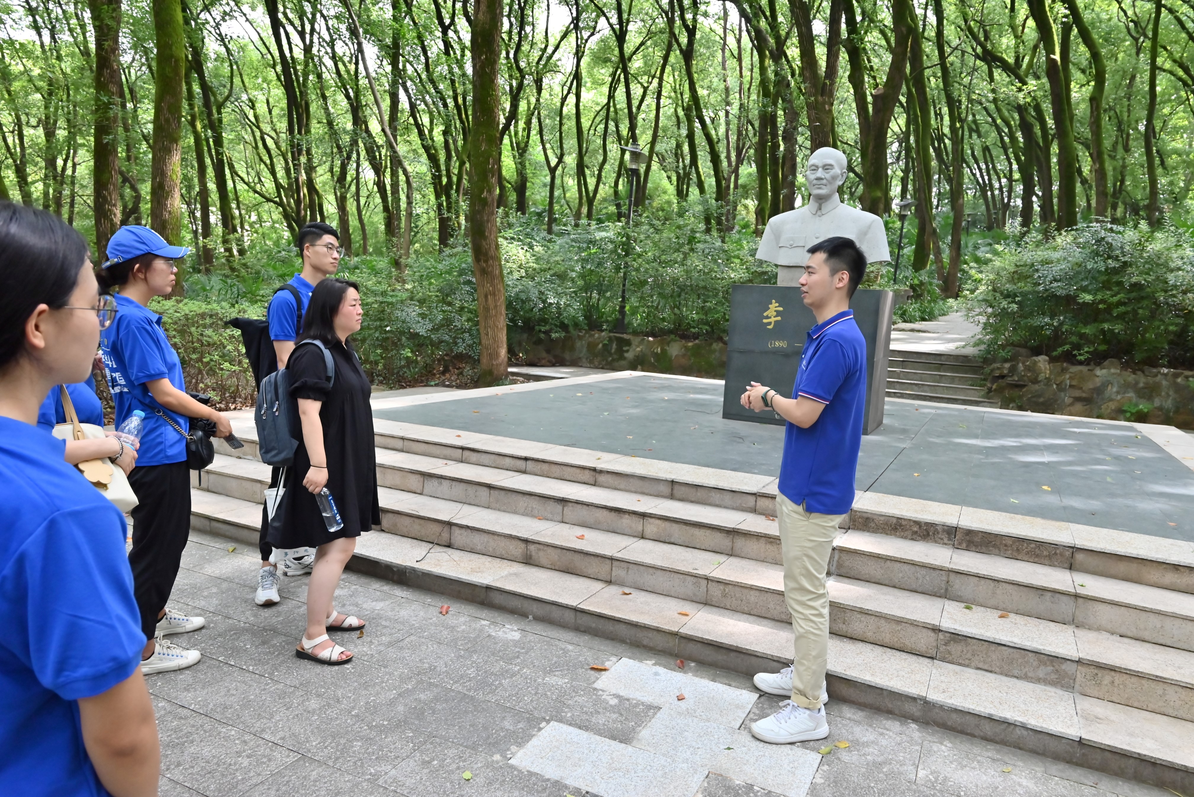 刘泽庭在李达校长塑像前讲解中共一大历史