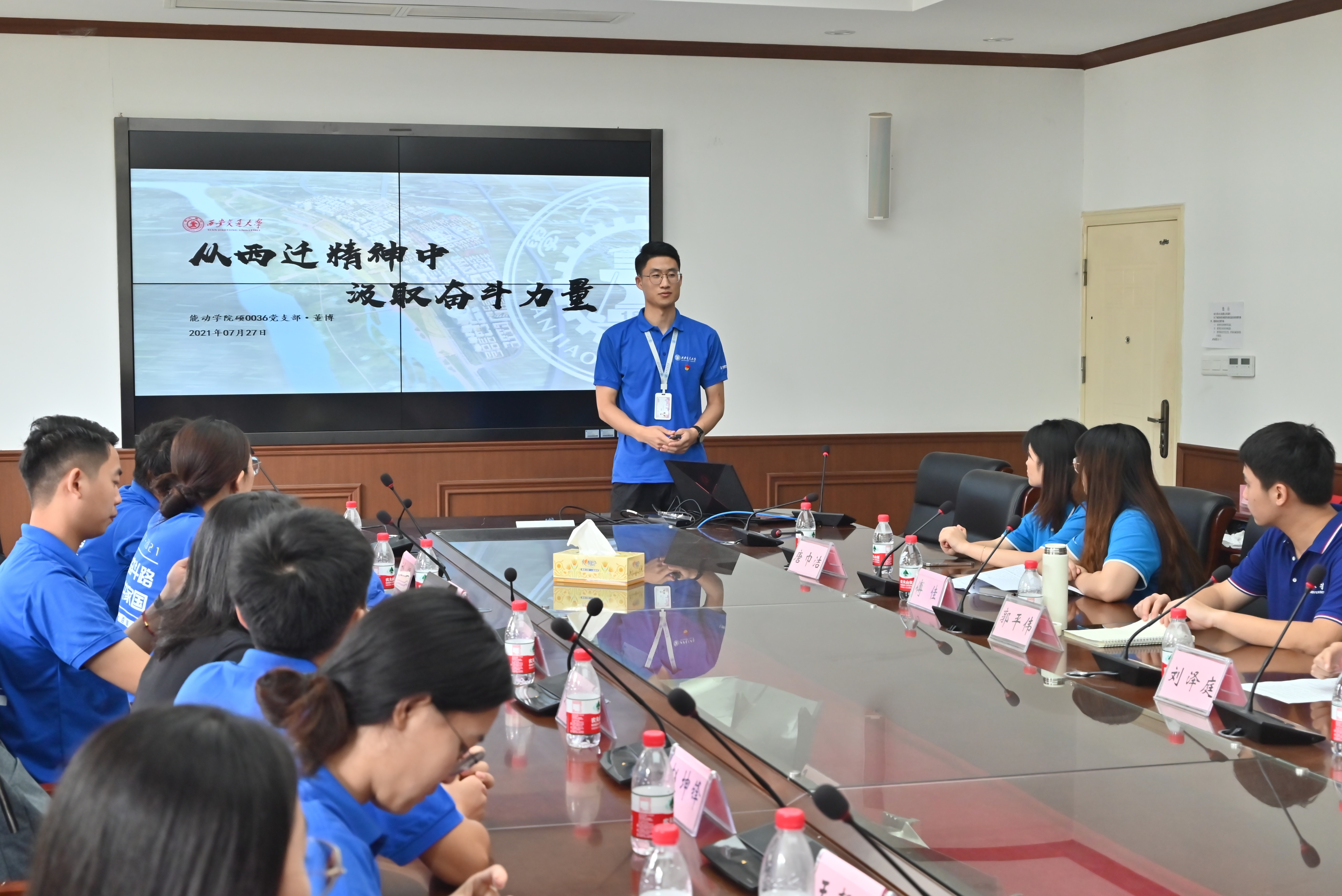 随后,西安交通大学能源与动力工程学院硕0036党支部书记董博介绍了西安交通大学的历史发展,并详细讲述了“西迁精神”。从条件优渥的上海毅然来到环境恶劣的西安,“胸怀大局,无私奉献,弘扬传统,艰苦创业”,这种投身西安建设祖国西部,听党指挥跟党走,与党和国家、民族和人民同呼吸、共命运的“西迁精神”让我们感触颇深、收获良多。