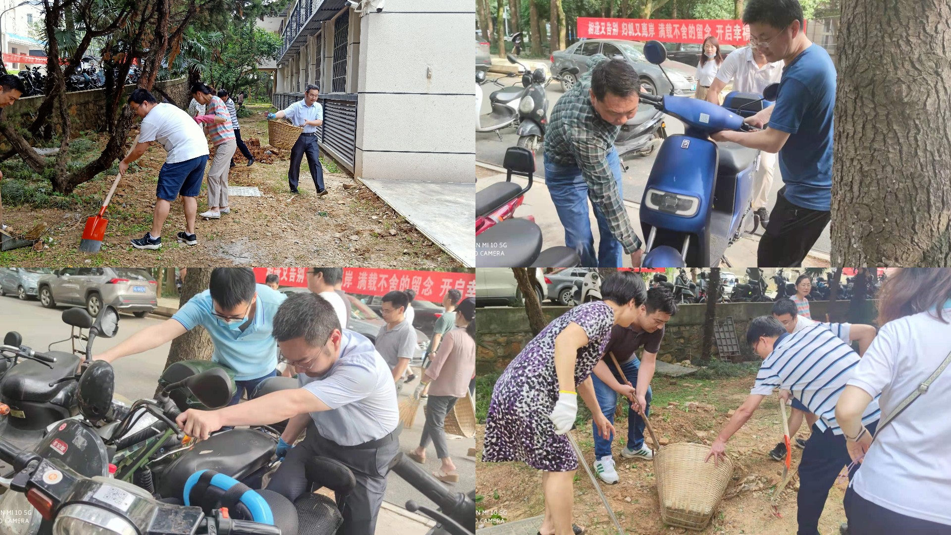 活动中,老师们先将九教周边乱停乱放的电动车移入指定区域,接着对九教周边进行了清扫。除了对人行道和三个门前进行清扫,大家重点对周边绿化带的卫生死角进行了清理,绿化带内的垃圾不易用清扫工具扫出,老师们就徒手将垃圾清理出来。经过老师们的认真清扫,九教周边环境焕然一新。