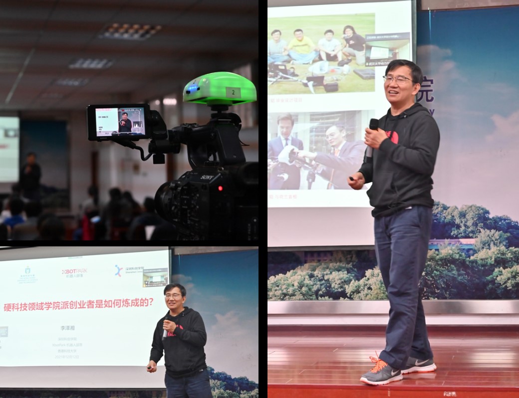 本网讯(通讯员:彭宇琦 编辑:刘泽庭 审核:胡耀武)12月13日晚7时,深圳科创学院发起人、XbotPark机器人部落创始人李泽湘教授携团队在学院学术报告厅举行“新智造时代——大学生能否做出影响世界的科技产品”主题讲座。巴卡漫画 院长刘胜、巴卡漫画 发展规划与学科建设办公室主任巫世晶、巴卡漫画 兼职副院长胡耀武参与了本次讲座。讲座同时设置了腾讯会议,bilibili视频弹幕网,微信小程序视频号3个分会场同步进行线上直播,全校师生踊跃参加。