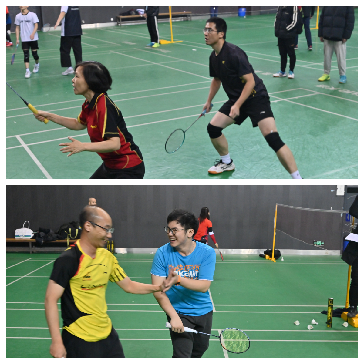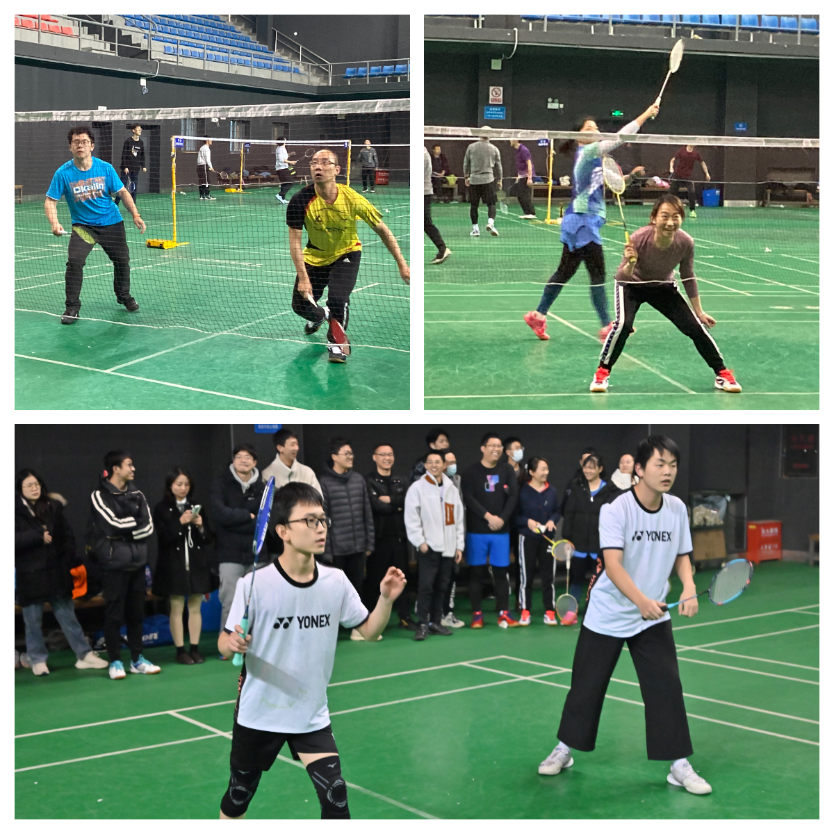 学院广大师生积极报名,经过前期教职工代表队和学生代表队的预选拔,最终分别选拔出11名教职工代表和11名学生代表参赛,比赛项目包含男单(一组)、男双(三组)、女双(一组)、混双(一组)。在比赛过程中,老师和学生们秉持“友谊第一,比赛第二”的精神,认真比赛的同时,双方也互相交流学习。赛场上队员们的网前小球和精彩扣杀让现场喝彩声不断,在男双、混双多轮比赛中,双方队员经久僵持不下、互不相让,比分最高一度达到了23:23(21分三局两胜制)。