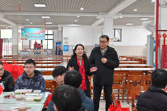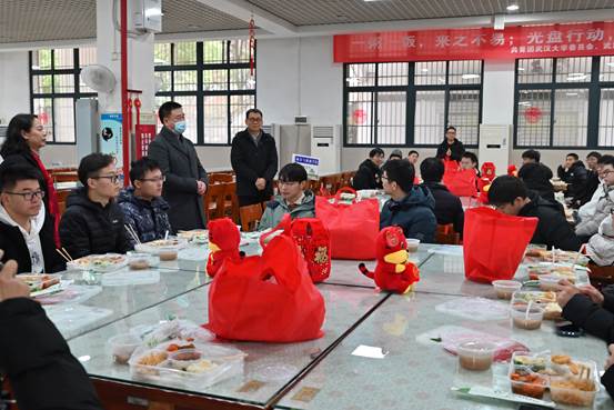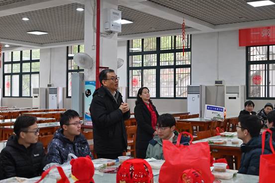活动期间,校党委副书记屈文谦等校领导看望留校学生。屈书记向大家送上新春祝福,学校为大家准备了春节礼包,希望大家能够在学校吃好学好,过一个家一般温暖的春节。因为疫情回不了家的同学,要与家里多联系,多关心家人,要注意寝室安全,在学校度过一个祥和欢乐的春节。