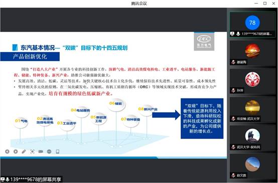 交流会上,学院党委书记孙萍致辞,并介绍学院学科优势、人才培养、产学研合作创新路线等基本情况。东方汽轮机有限公司科技管理部副部长文圆圆介绍了东汽“十四五”期间深入开展“政产学研用”协同创新和产业链合作情况。之后,学院副院长郭江教授、以及胡雪蛟教授、赵福云教授、岳亚楠教授、侯佑民教授、赵文胜教授、谢诞梅教授先后介绍了自己的科研团队在碳中和、ORC(地热)、储能、氢能、燃气轮机、核电等方面的科研优势和技术储备。