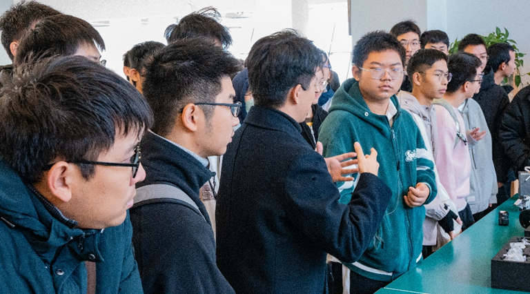 随后,技术人员针对一台被完全拆解的机器人,详细讲解了其内部结构:从负责动力输出的高精度关节模组、伺服驱动器,到感知环境的视觉传感器、激光雷达,再到作为“大脑”的控制系统主板。这种“解剖麻雀”式的讲解,将《机械设计》、《自动控制原理》等课程中将要学到的知识与实际部件一一对应,使同学们对机器人的构成与工作原理有了透彻认识。