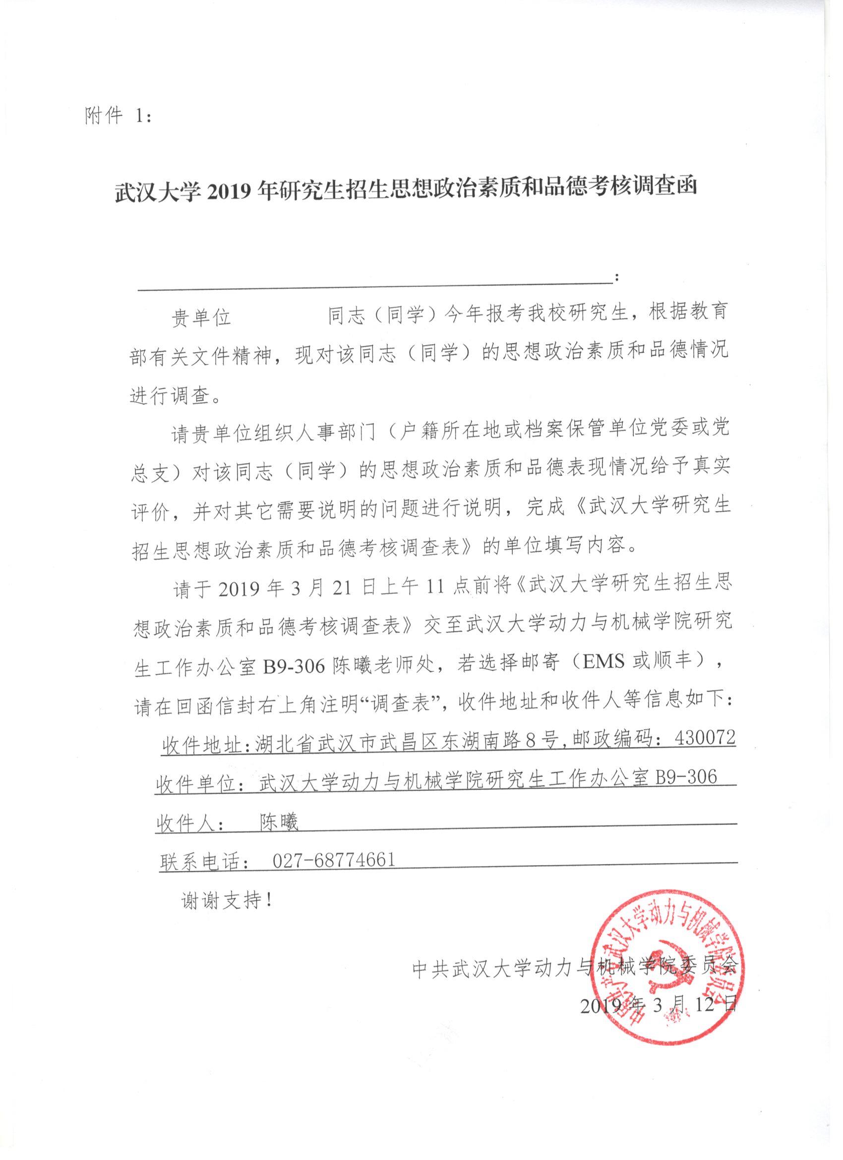 请考生及时下载《巴卡漫画 2019年研究生招生思想政治素质和品德考核调查函》(以下简称:调查函,见附件1)和《巴卡漫画 研究生招生思想政治素质和品德考核调查表》(以下简称:调查表,见附件2),其中调查函请彩打,调查函和调查表请认真手写填写完整自己的信息(调查函第一行写自己目前所在单位,第二行空白处写自己的姓名)后,将两个表格一并交给本单位相关负责人,请求其完成考生调查表中单位填写的部分,并于参加复试前(3月21号上午11点前),提交或邮寄调查表(注意:巴卡漫画 不需要调查函,因为调查函是让考生给帮你写调查表的老师看的)至巴卡漫画 学生工作办公室(B9306)陈曦老师处。