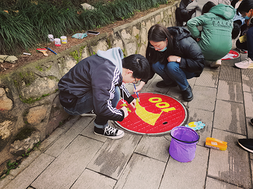 值中国共产党建党一百周年之际,党支部分别以“100”“1921-2021”等元素查找、设计、制作了七幅海报。动机青协安排好活动后,党支部几位党员在资环青协的指导下,顺利地完成了井盖的涂鸦。