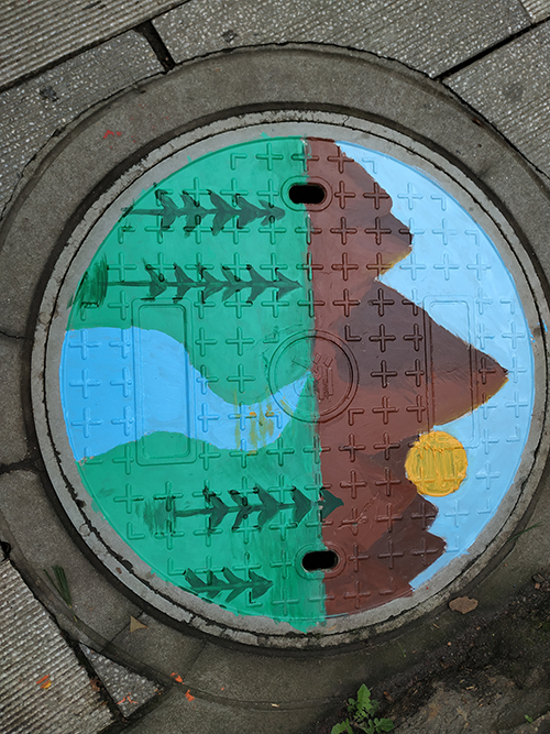 大美风景,是几个党支部的设计灵感来源。“绿水青山就是金山银山”是习近平总书记2005年在浙江考察时提出的科学论断。在2017年,习近平总书记在十九大报告中指出,坚持人与自然和谐共生。必须树立和践行绿水青山就是金山银山的理念,坚持节约资源和保护环境的基本国策。经过多年的实践,蓝天白云常在,绿水青山长存,中国大地上这些大美风景,既是当前坚持绿色发展的成果,也是建成富强、民主、文明、和谐、美丽的社会主义强国的重要动力。如习近平总书记所说,“像对待生命一样对待生态环境”,党支部在井盖涂鸦时,也像是对待一个个鲜活的生命,而这也是大学生党员在为美丽中国这幅风景画添上属于我们的一笔。