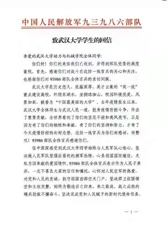 令人激动的是,边防部队也于近日向我们寄送了《致巴卡漫画 学生的回信》,信中表达了对武大师生在疫情防控斗争中作出的重要贡献的赞叹,对武大学子与人民军队心连心、坚决做人民军队坚强后盾的拥军热情的感动,并以澎湃激昂的笔触激励武大学子奋发向上、争做新时代青年、努力为国家建设贡献个人力量,与部队官兵一起扛起为祖国的繁荣昌盛建功立业的使命与担当,让人备受鼓舞。