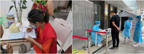 (左图为梁琼文同学入户排查;右图为王家玲同学志愿值班)