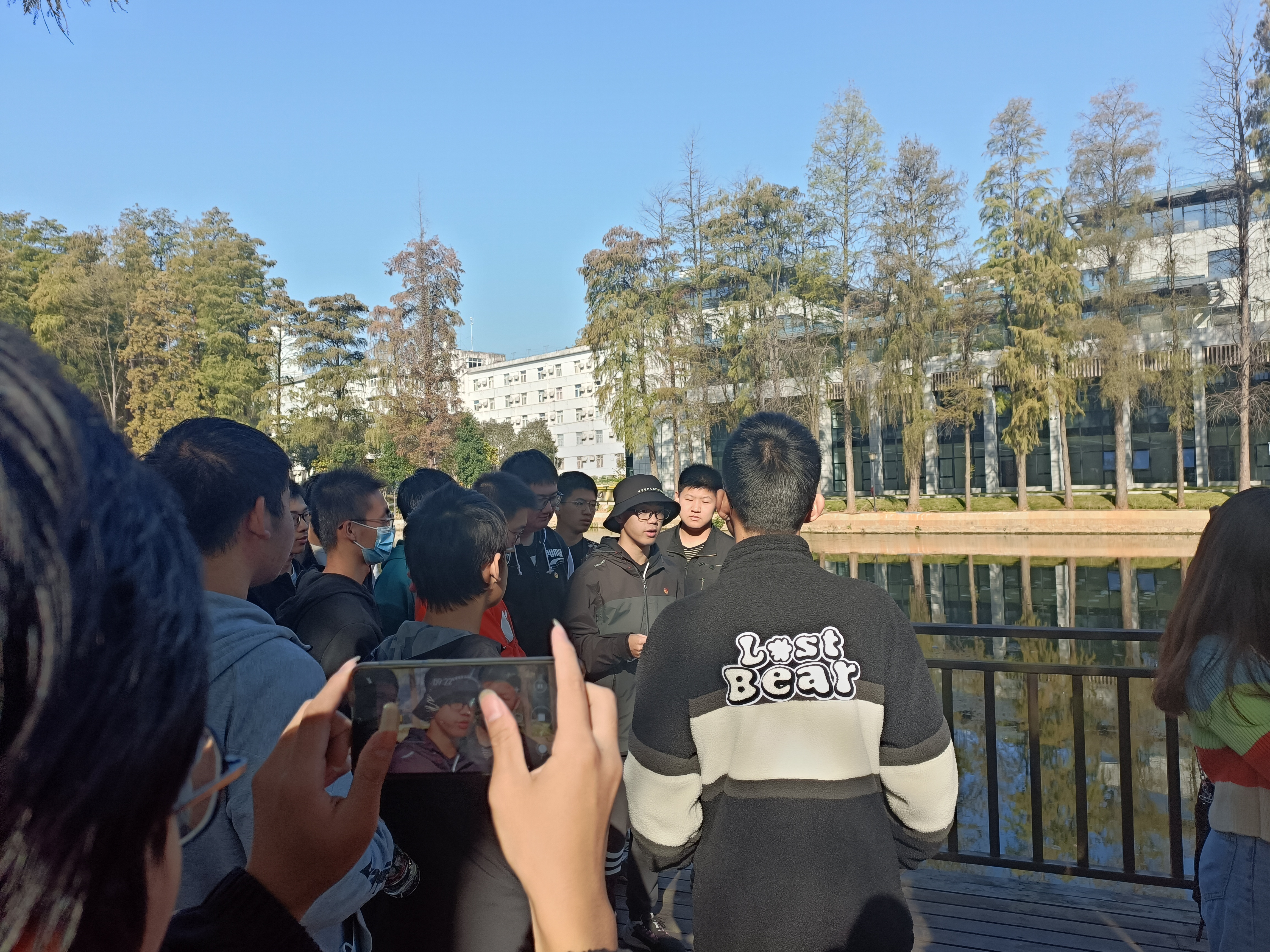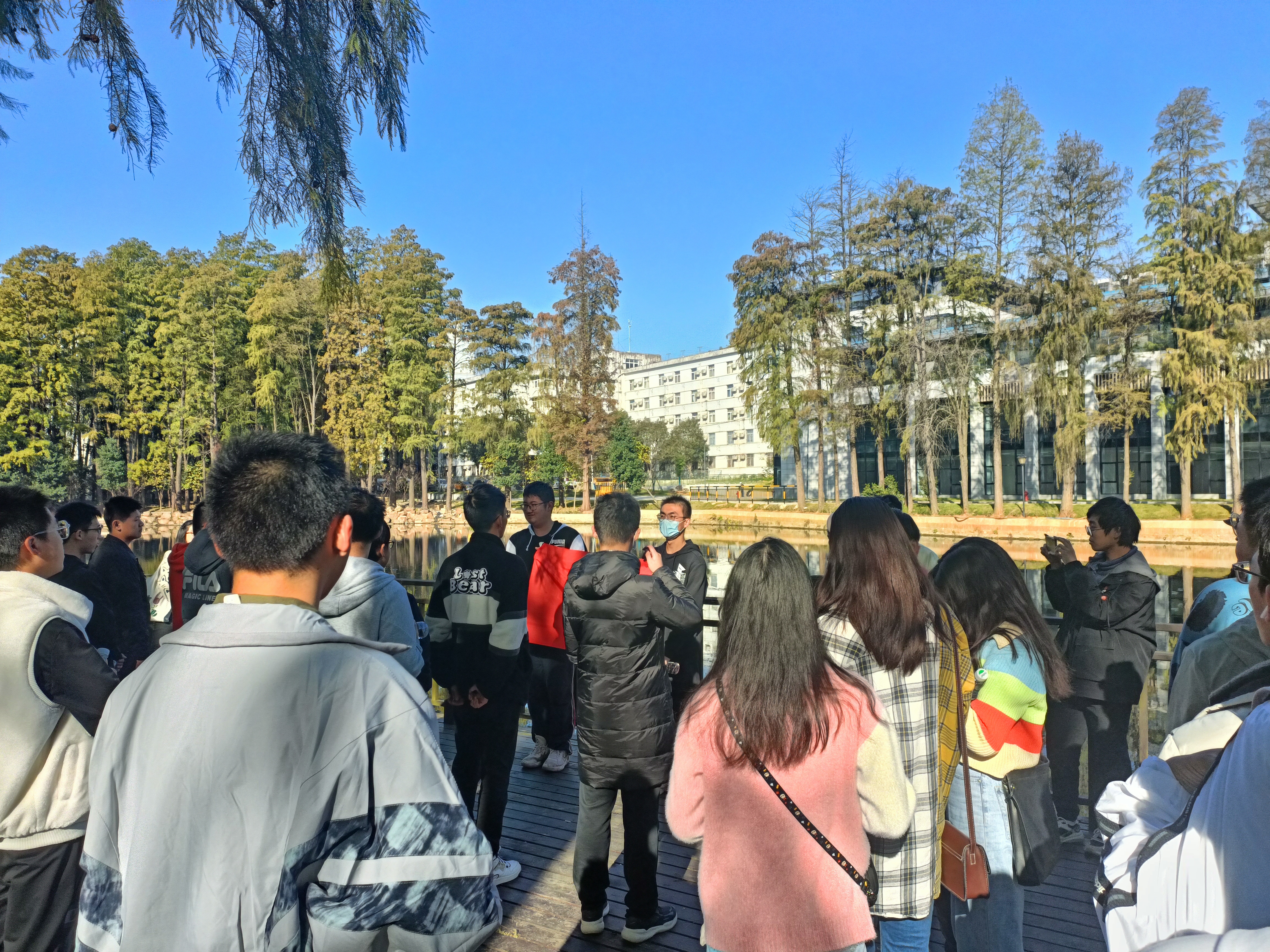徒步的第一站是月湖边的空地,丁子恒在此展开了新民主主义革命时期党史宣讲,介绍了我们党在建立初期经历的风雨,使团员们体会到党在发展初期的不易。在月湖旁边开展建党初期历史的宣讲更能让团员们切实体会到“红船精神”之内涵。
