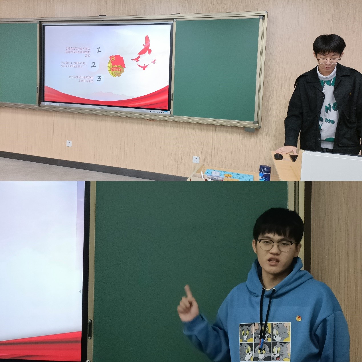 接下来为让大家更加了解十九届六中全会,关浚哲为团员们播放视频,又详细讲解了十九届六中全会的内容:总结党的百年奋斗重大成就和历史经验的重要意义、指出中国共产党百年奋斗的历史意义、做出百年征程中各阶段的主要任务总结。之后,他又为大家介绍了党自建立以来的作为。接下来,团员们针对此次会议发表自己的感言,畅所欲言,向大家讲述了自己心目中的党和国家在我们生活中的重大意义。