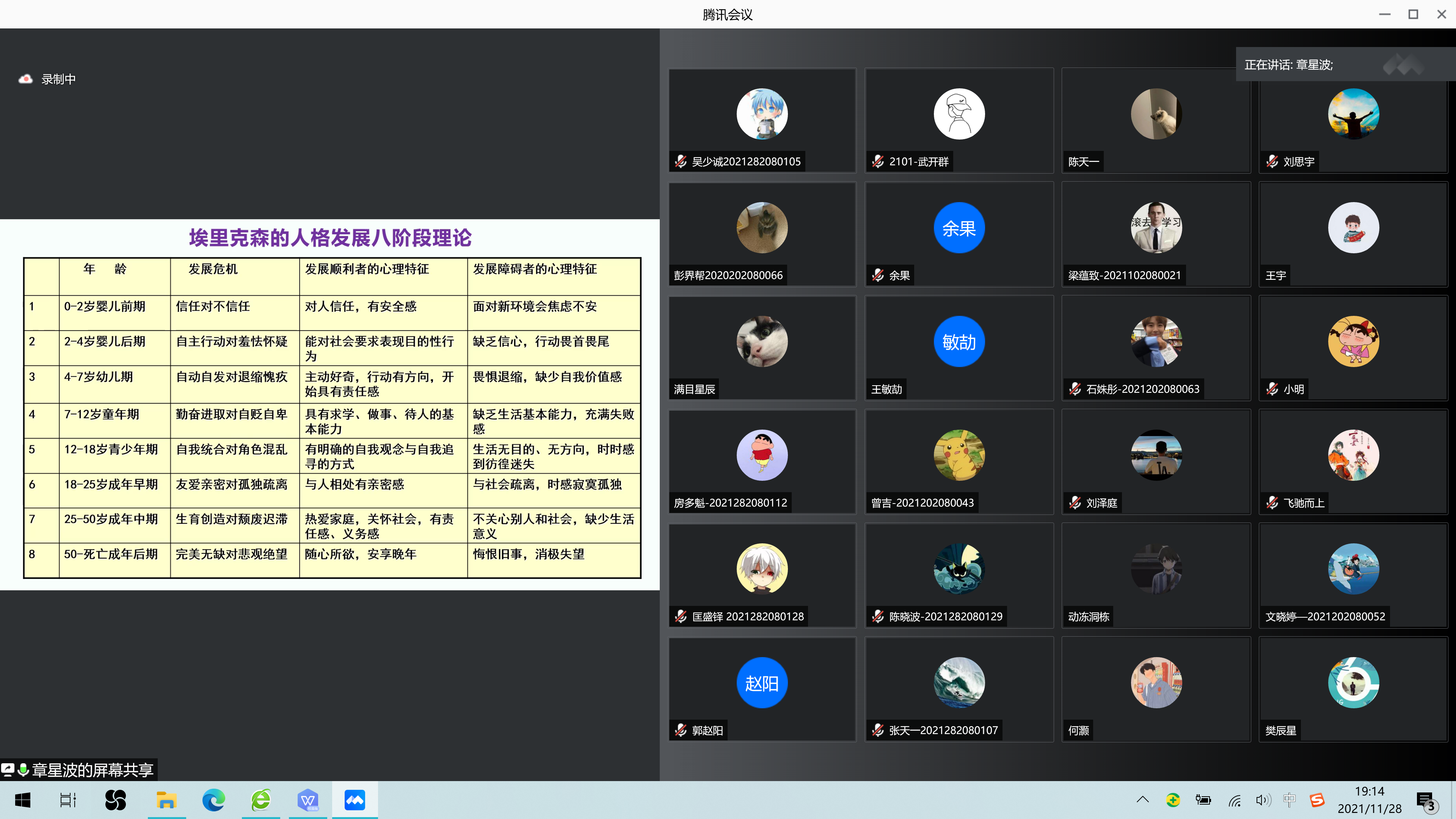 本网讯(通讯员:代洪伟 编辑:郭思谊 审核:刘泽庭)为了尽早发现研究生心理安全隐患,加强积极健康的心理建设引导,11月28日晚,巴卡漫画 研究生心理健康教育讲座顺利召开,主讲人为巴卡漫画 大学生心理健康教育中心副主任章星波。讲座从心理问题的产生原因、心理危机的分类和心理危机干预方法等方面做了详细讲解,研究生辅导员刘泽庭及2021级全体研究生参加了本次会议。为响应疫情防控政策,会议采用线上形式进行。