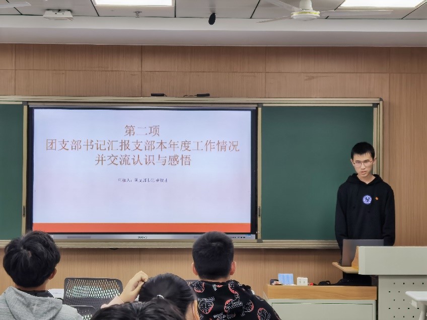 第二项,由团支部书记崔致埔汇报支部工作情况并作交流。他从党史学习教育、青年大学习、推优入党等多方面回顾了支部的年度工作情况,并勉励在场团员青年不忘初心,继续奋斗,加强理论学习特别是党史学习,积极向党组织靠拢。