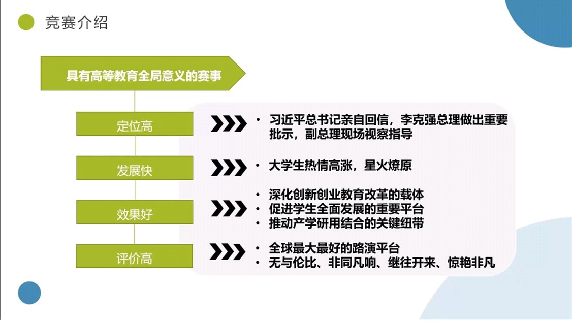 大会第二项,由2020级辅导员黄呈棋老师面向同学们做竞赛动员。同学们首先观看了“互联网+”大赛的宣传视频,了解了大赛庞大的规模以及创新创业对国家,对社会的影响力。黄老师接着对大赛做了更加详细具体的阐述,并从赛事激励和专家指导等方面向同学们展示了学校对参赛项目提供的全方位支持。