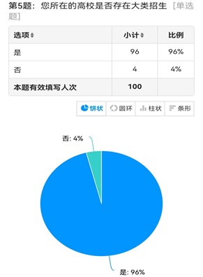 据受访者所认为,现阶段,大部分院校大类招生存在不落实地的问题。大类招生后,很多学校或院系并未对相对应的专业有细致的介绍和相关的专业入门课程,导致大家选专业的时候仍然是一头雾水。并且大类招生的专业分流成绩占据的比重过大,公平性有待提高。针对这一问题,学校规划专业导论课安排时应更加细致,并且调整好学生意愿与成绩对于分流的影响比例。学生则需尽自己所能去了解并努力。
