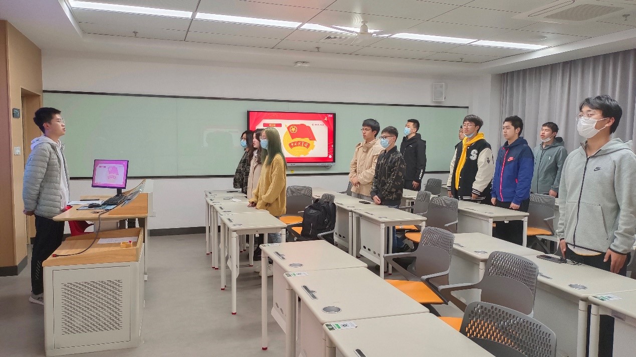 活动伊始,团支书陈俊文带领团员重温团歌,全体团员们起立,声音铿锵有力,展现了新时代青年应有的蓬勃朝气!同时,慷慨激昂的曲调也渐渐地把团员们的心境带入到了“光荣的中国共青团”中。