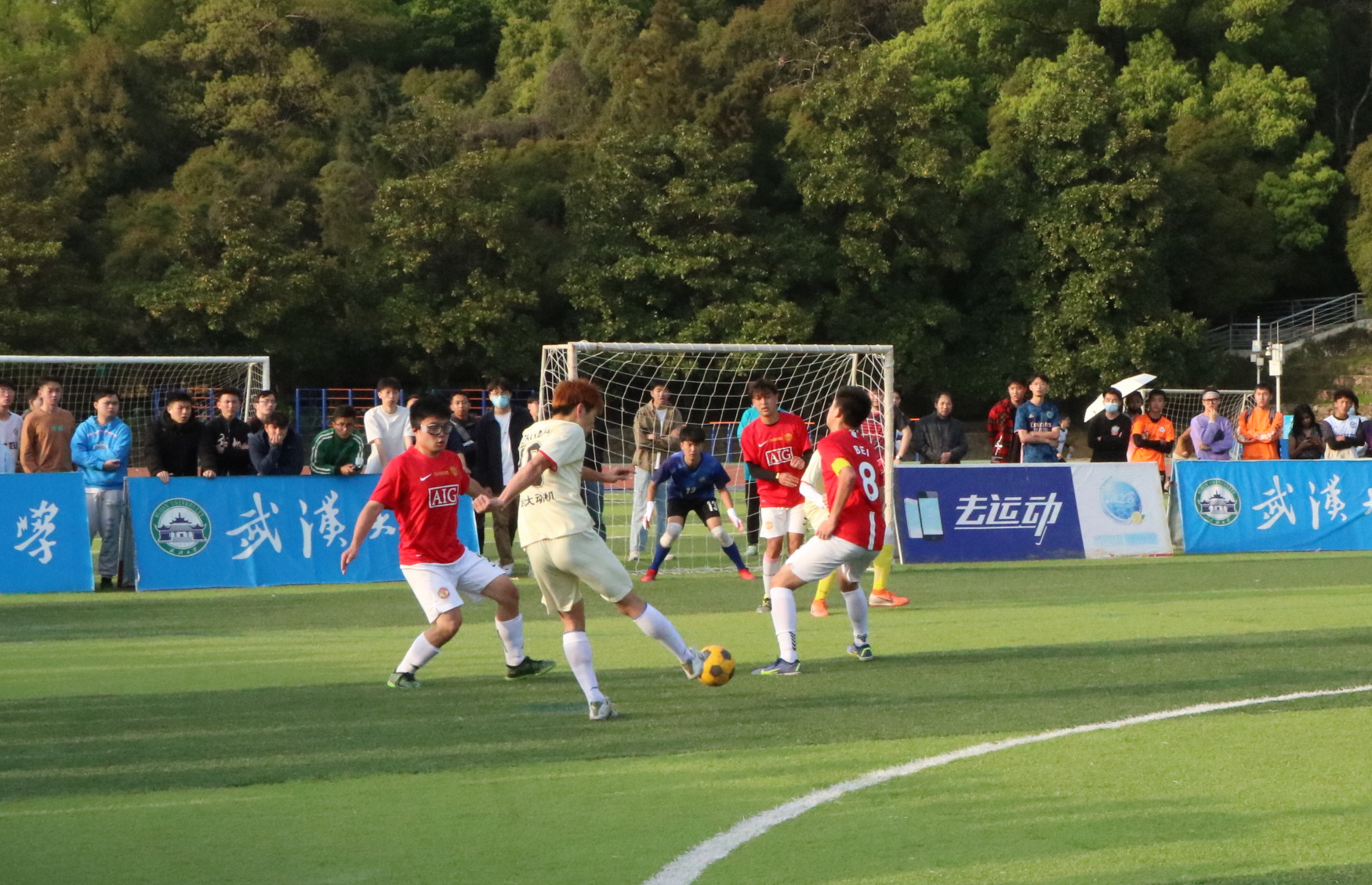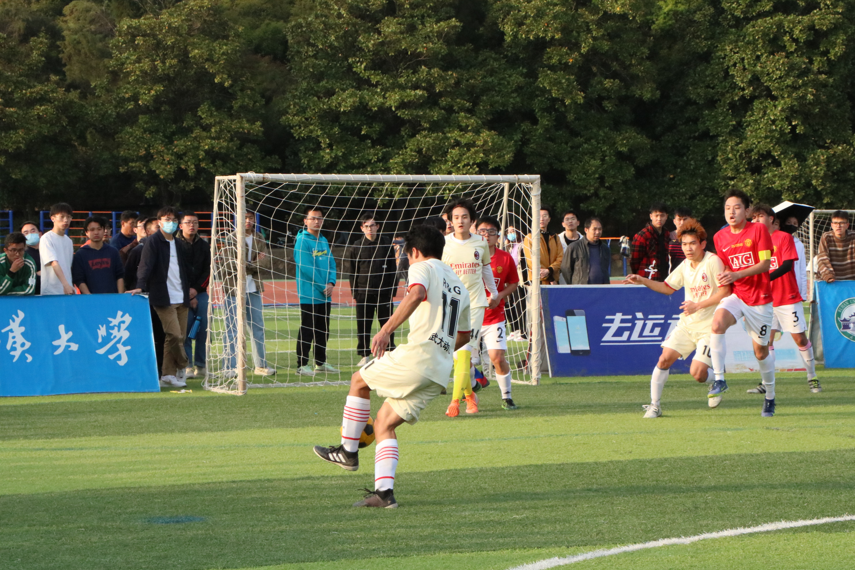 下半场开始,比赛气氛持续高涨,双方的对抗也来到了白热化阶段。我方球员率先掌握了主动权,大部分时间都是我方将球权握在手中,终于在第25分钟时,10号庄琎抓住对方防线的小漏洞,一脚打门直扑球门底角,将比分扳平——10号不愧是我方大心脏球员!在之后的几分钟我方也越战越勇,10号庄琎与22葛清扬默契传控,创造出多次打门机会,可惜被对方门将扑出,未成功得分。在之后对方的一次边线球中,对方8号拿到球带到底线想再来一记射门,但我方11号反应迅速,一记滑铲将皮球挡下,化解了这波攻势。但在之后对面的一波进攻中对方2号在接到球后一记吊射刚好抓住了我方守门员出击的空挡,皮球沿着门杆下沿滑入球网,尽管我方守门奋力转身扑救,但最终还是差了一丝,比分来到了2:3。比赛只剩下五分钟,此时不仅是技术的比拼,更是意志的比拼。我方球员展现出了极强的韧性,在这样的绝境下依然保持冷静,寻找机会,最终1分钟后22号葛清扬在边路接到传球,边路空旷,22号抓住机会一脚爆射将球打进,扳平比分!