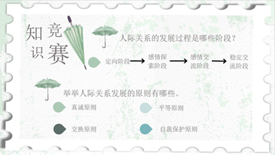 接下来,班会进入了心理健康知识竞答环节,王家玲为加强同学们对相关主题的理解,准备了一些题目让同学们竞答,同学们争相答题,在抢答的过程中,既有乐趣,又丰富了自己的心理健康知识。