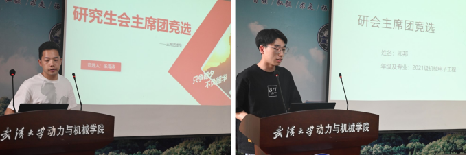 参与此次学院主席团成员增补竞选的候选人有2021级机械电子工程专业硕士生邬邦、2021级流体机械及工程专业硕士生张海涛。他们依次上台进行演讲,展示了自己的竞争优势和对主席团工作的见解,总结了过去一年的工作经历,并对接下来的工作进行规划及创新。