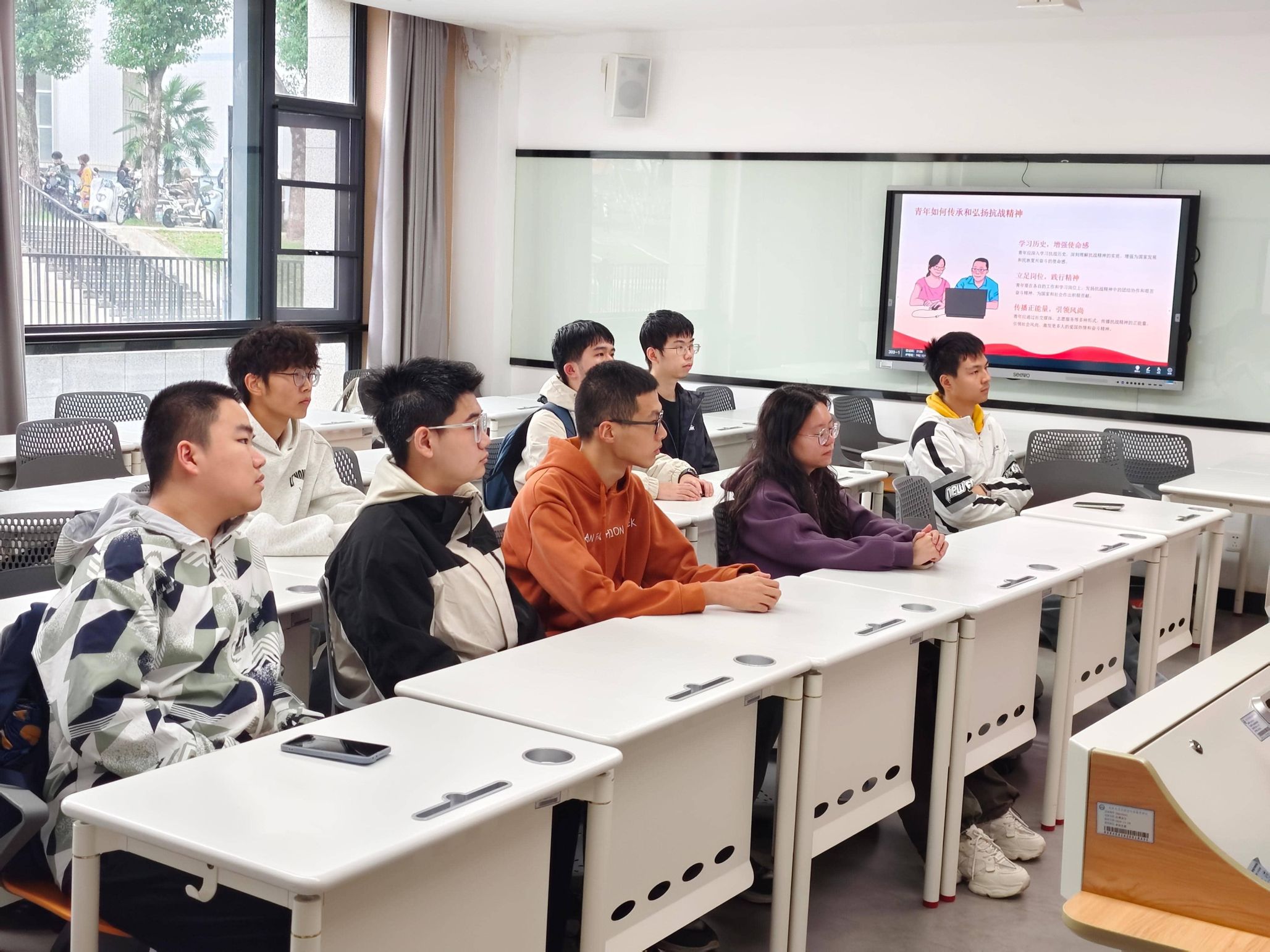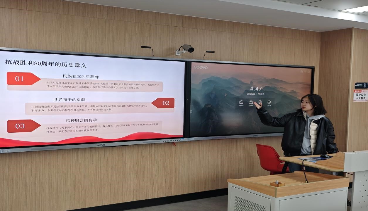 活动伊始,团支部书记王悦然围绕“抗战胜利80周年的历史意义”展开讲解,从“民族独立的里程碑”“世界和平的贡献”“精神财富的传承”三个维度,系统阐述了中国人民抗日战争在近代中国历史进程中的重要地位。这是中国反抗外敌入侵第一次取得完全胜利的民族解放战争,中国人民以3500万军民伤亡的巨大牺牲,为世界反法西斯战争胜利作出不可磨灭的贡献,而“天下兴亡、匹夫有责的爱国情怀,视死如归、宁死不屈的民族气节”也成为融入民族血脉的精神基因。