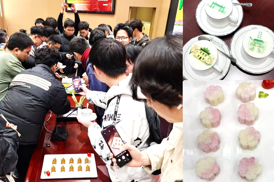 付强老师精心设计的互动环节将现场气氛推向了高潮。其中最令人难忘的,是他匠心独运的文创菜品品鉴环节——清新淡雅的酸奶在舌尖绽放着春日清甜,甜润适口的樱花糕使唇齿留芳。同学们细细品味着这些承载着文化密码的创意点心,在付老师娓娓道来的讲解中,领悟到每道菜品背后“食不言”“长者先”的礼仪精髓。这不仅仅是一场味觉的盛宴,更是一次生动的文化浸润,在齿颊生香间,让同学们切身感受到中华礼仪与饮食文化的水乳交融,真正体会到了“庖厨之间见大千”的深厚意蕴。