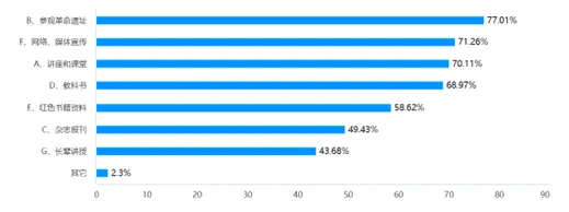 2.了解红色文化和红色精神教育的方法,主要有参观革命遗址、网络媒体宣传、讲座和课堂、教科书、红色数据资料、杂志报刊、长辈讲授等。其中通过参观革命遗址了解红色文化的方式最为普遍,而通过长辈讲授的方式相对罕见。这反映了家庭对红色文化的传承力度不够,大部分家长不愿意通过讲授的方式传承前辈的红色文化,这也导致了红色文化传播上的断层现象。此外,父母长辈通过口述传承红色文化,对子女的进一步了解有帮助,所以鼓励红色家风、红色血脉、红色基因的传播是很有必要的。