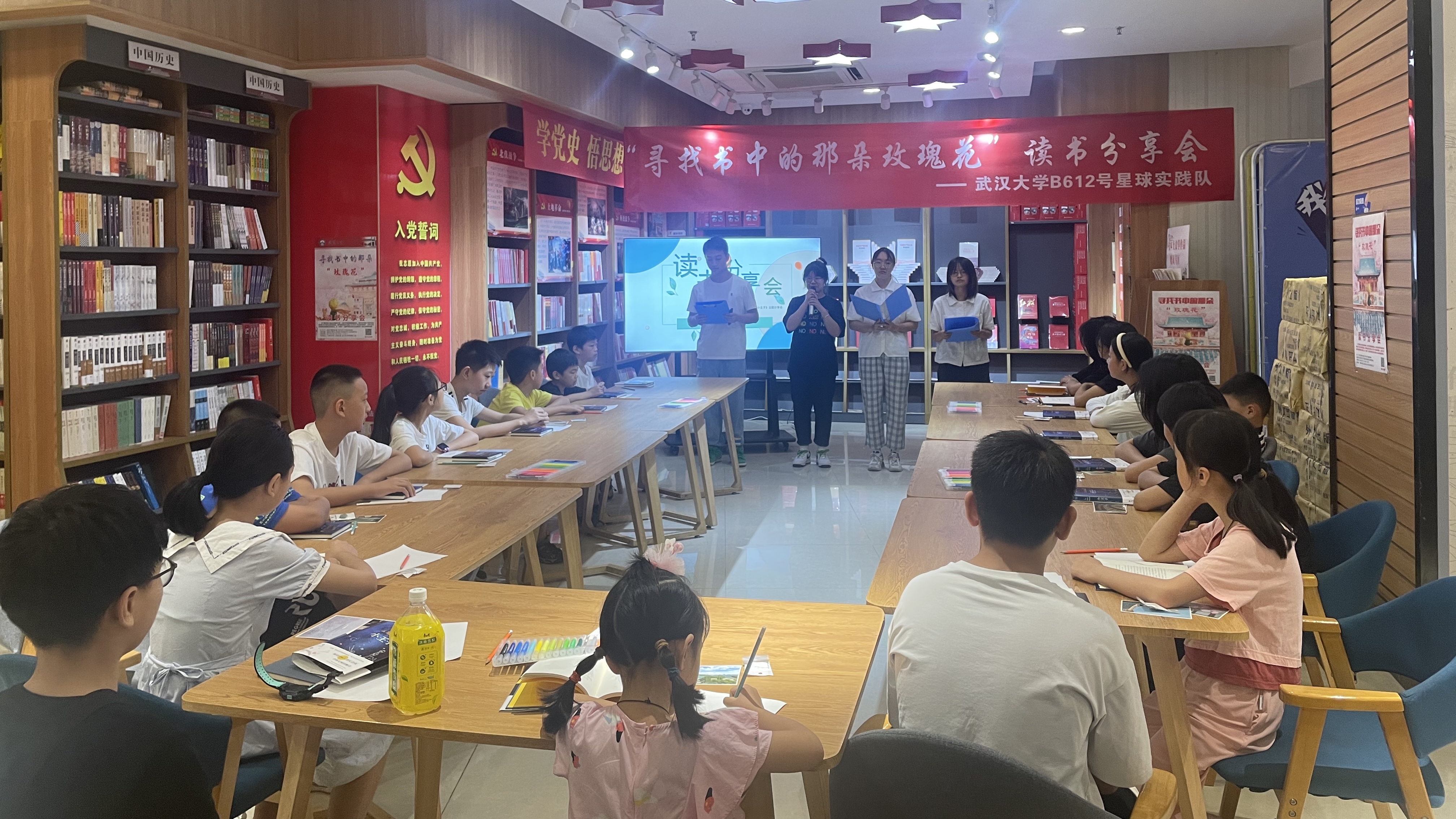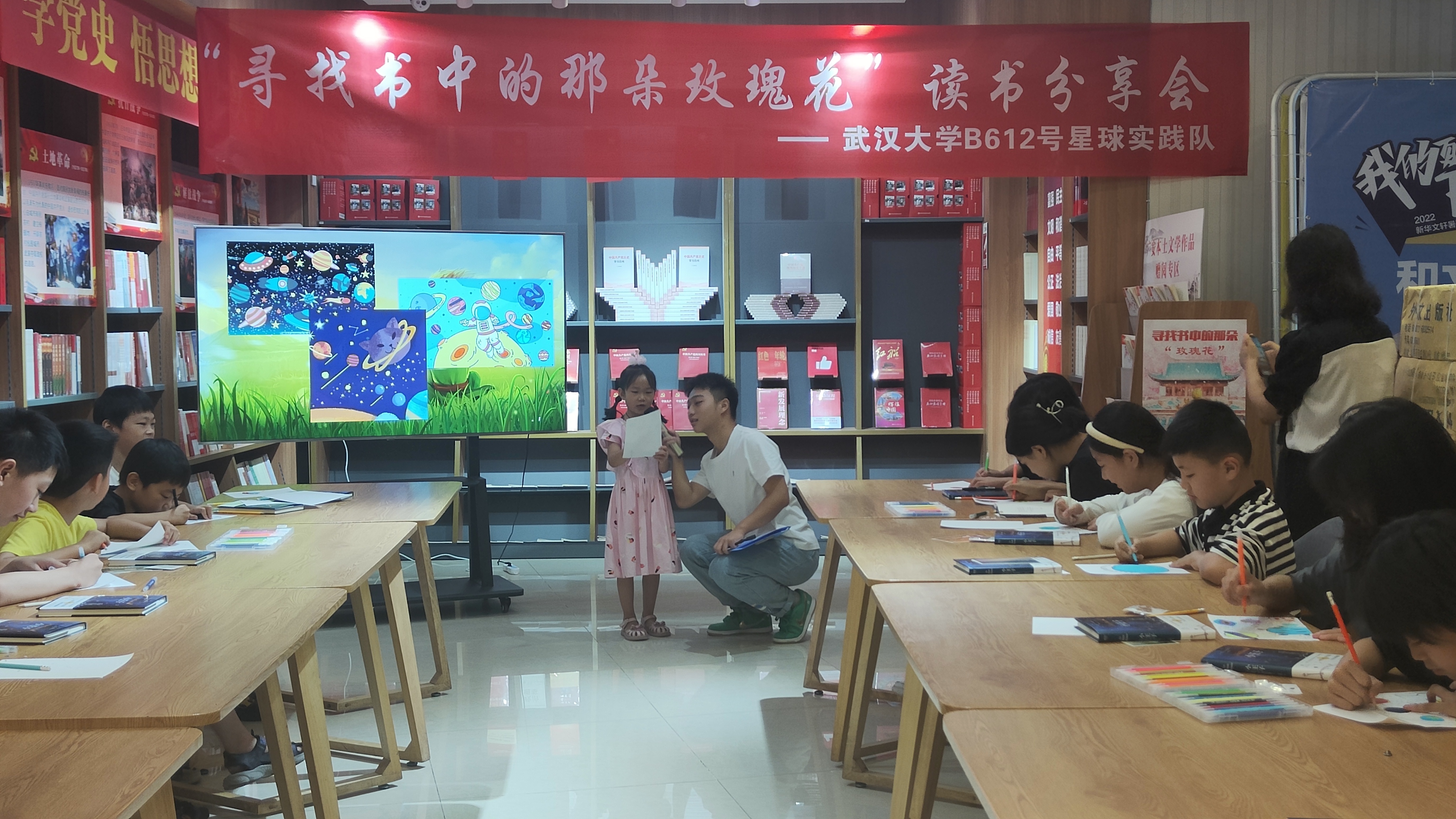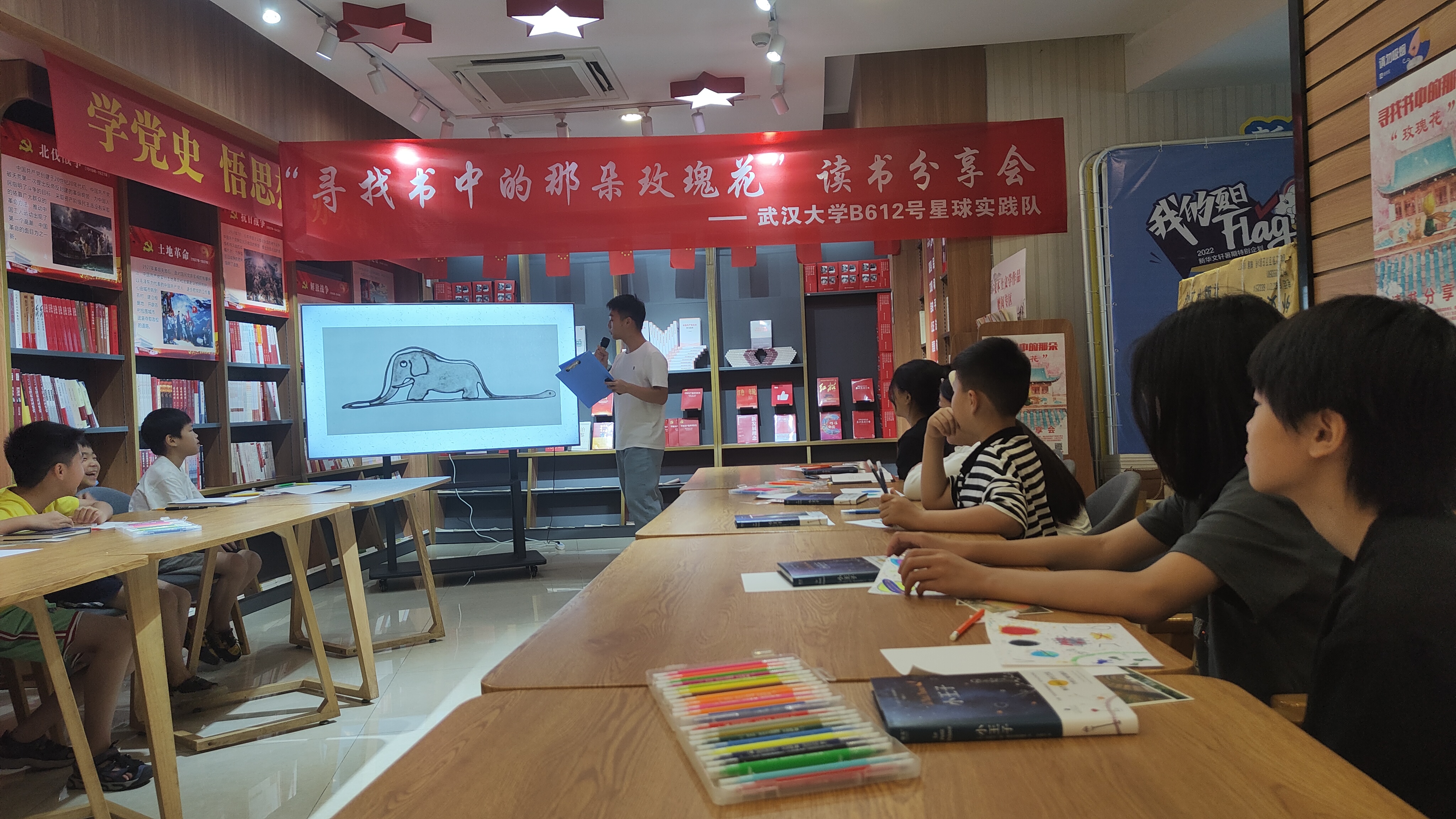 (通讯员:刘佳伶)夏日蝉鸣,掬起一帘清梦,书店也刚刚苏醒,等待人们领略书中的大千世界。2022年8月20日上午,“反哺家乡·书香远播”专题社会实践——“寻找书中的那朵玫瑰花”读书分享会正式开始。此次活动由巴卡漫画 赴四川省广安市B612号星球实践队主办,指导老师为郝华丽老师。实践队队长巴卡漫画 测绘学院严瑾带领队员信息管理学院本科生欧雪羽、巴卡漫画 本科生刘佳伶、电气与自动化学院本科生贺海洋开展此次活动。活动现场还邀请了广安友谊加德学校的周利洪老师莅临指导。截至活动开始,共有18名儿童报名参加。小朋友们在家长的陪同下安静有序地就坐。活动现场,志愿者们也为小朋友发放了《小王子》书籍和一些礼品。