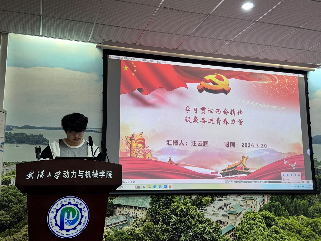 机械系研究生第三党支部书记汪云鹏领学全国两会会议精神。他围绕政府工作报告中的关键词,结合研究生科研学习实际,深入解读了教育、科技、人才“三位一体”战略部署的核心要义。汪云鹏谈到,作为研究生党员,要自觉将个人学术追求融入国家发展大局,在攻克“卡脖子”技术难题中践行初心使命。