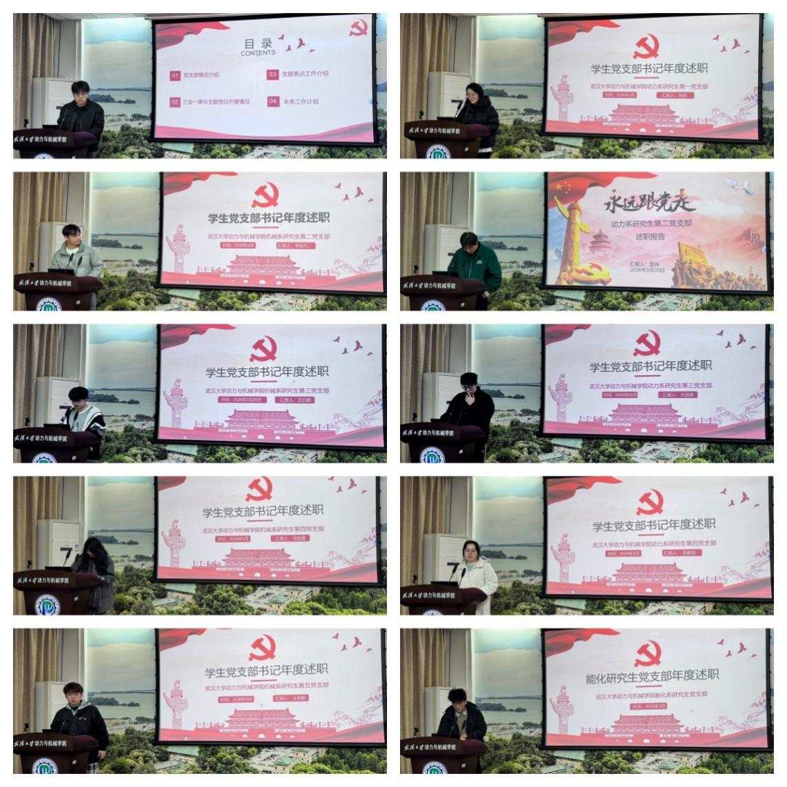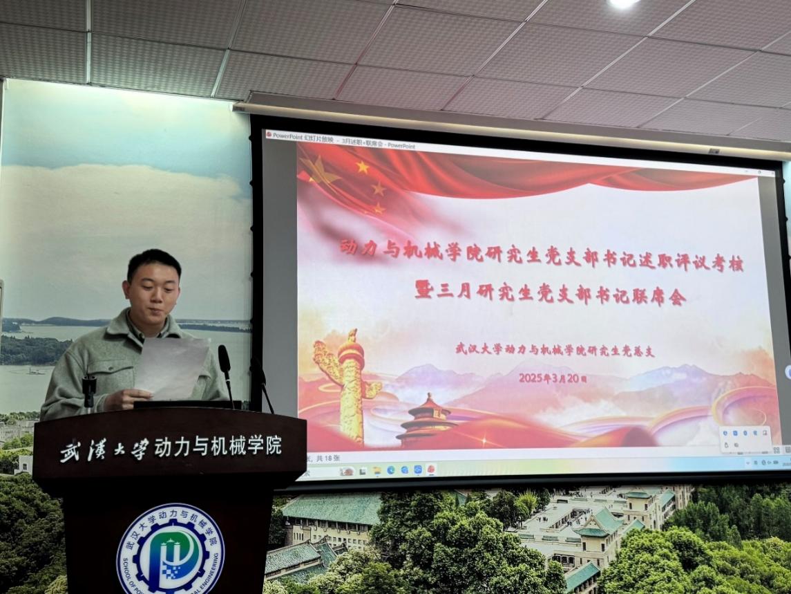 在述职评议环节,各研究生党支部书记依次上台,围绕党员教育管理、组织生活开展、支部特色活动、党员先锋模范作用发挥等方面,对过去一年的履职情况进行了全面汇报。述职中,各支部既展示了“三会一课”规范化落实、主题党日创新开展等亮点工作,也深刻剖析了支部建设中存在的活动形式单一、理论学习深度不够、与专业结合不紧等问题,并提出了针对性的整改措施和下一步工作计划。