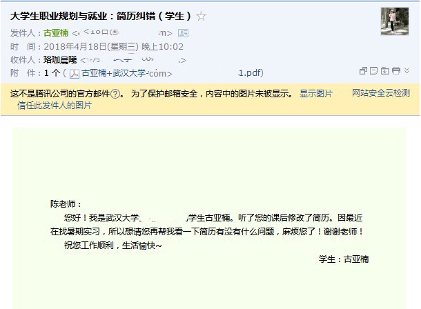 课程接近尾声时,巴卡漫画 和城市设计学院两个同学分别表示这节课最大的收获在于掌握简历制作方法,进一步明确今后努力方向。课程最后,陈曦留下自己的联系方式和邮箱,欢迎同学们课后和她进一步交流。据了解,当晚她就收到一名叫古亚楠的同学的邮件,希望老师可以帮忙修改自己的实习简历。