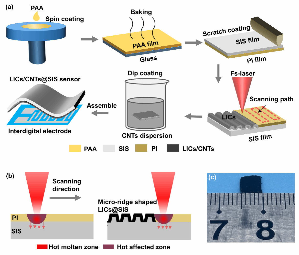 研究二:近期,基于激光诱导石墨烯(LIG)的柔性压力传感器受到了广泛关注。引入分层微结构是提高压力传感器灵敏度的有效方法。然而,如何通过简单、低损伤的工艺在 LIG 薄膜上实现分层微结构仍然是一项挑战。本文利用低熔点热塑性基材苯乙烯-异戊二烯-苯乙烯(SIS)在激光热效应下的重塑特性,采用简单的一步激光热成型工艺,在 LIG薄膜形成过程中自发形成表面微结构。因此,一步激光辐照工艺在LIG薄膜上实现了由多孔结构和表面微结构组成的分层结构。此外,还提出了一种将分层微结构与碳纳米管(CNTs)/LIG 复合材料相结合的混合策略,以提高基于LIG的压力传感器的灵敏度。