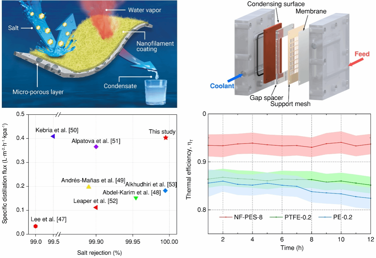 膜蒸馏 (Membrane distillation, MD)是利用低温废热实现海水淡化和污水处理的重要技术之一,有助于水资源的开源增量和回收再利用,是解决全球水资源短缺的有效措施。然而,如何同时提升膜蒸馏过程中微孔膜的产水能效、抗润湿与抗污染性能,是未来实现大规模产业化应用的一项艰巨任务。本研究创新性地提出了一种复合微纳米层级多孔膜的设计与规模化加工方法,解决了MD膜的设计瓶颈问题,在极端恶劣工况下 (如超高水压或进料液为低表面张力液体)仍能实现高效的海水淡化。