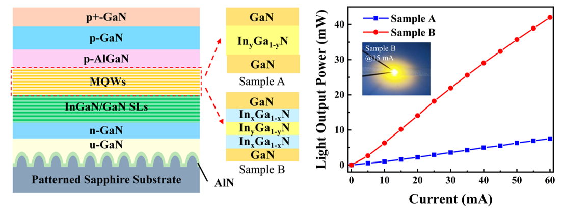 III族氮化物LED以其低能耗、长寿命和体积小等优点,逐渐成为传统光源的重要替代。一般来说,InGaN量子阱中铟(In)含量越高,LED发光波长越长。然而,随着铟组分的增加,InGaN量子阱面内压应力升高,会产生较强的极化场,导致InGaN基黄光LED量子效率仍然比蓝光LED低很多。周圣军教授研究小组扩展了能带工程在长波段LED中的应用,并分析了阶梯形量子阱对器件光电性能和晶体质量的影响。与方形量子阱 LED相比,具有阶梯形量子阱的黄光(〜570 nm)LED表现出更高的光输出功率及更优的晶体质量,研究结果以《Rational construction of staggered InGaN quantum wells for efficient yellow light-emitting diodes》为题发表在国际权威期刊《Applied Physics Letters》。论文第一作者为巴卡漫画 博士生赵晓宇,论文通讯作者为周圣军教授,巴卡漫画 为论文第一作者和通讯作者单位。(原文链接://aip.scitation.org/doi/10.1063/5.0043240)