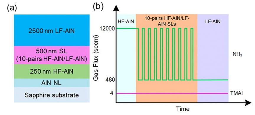 AlGaN基深紫外 (DUV) LED在杀菌消毒方面引起了广泛关注。外延生长在蓝宝石之上的AlN对紫外光透明并且具有价格优势,是目前应用最广泛的AlGaN基DUV LED衬底。然而,AlN和蓝宝石之间较大的晶格常数失配导致外延生长的AlN薄膜中存在高密度的位错,限制了AlGaN基DUV LED外量子效率的进一步提升。周圣军教授研究小组设计了一种交替V/III比的AlN超晶格结构,实现了较低生长温度(1180 摄氏度)下AlN薄膜的高质量外延生长。利用透射电子显微镜证明了交替V/III比的AlN超晶格结构可以引发穿透位错的倾斜,从而增加了穿透位错之间反应的几率,促进了位错的湮灭。此外,倾斜的位错还在平行于c面的方向上提供了失配位错的分量,从而促进了生长过程中张应变的释放,消除了开裂的风险。相关研究结果发表在国际权威期刊《Applied Physics Letters》,论文题目为《Strain management and AlN crystal quality improvement with an alternating V/III ratio AlN superlattice》。论文共同第一作者为唐斌、万泽洪和胡红坡,论文通讯作者为周圣军教授,巴卡漫画 为论文第一作者和通讯作者单位。(原文链接://aip.scitation.org/doi/10.1063/5.0048656)