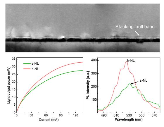 为进一步提高绿光LED效率,周圣军教授研究小组开发了由溅射AlN和中温GaN组成的复合成核层。在复合成核层之上继续外延生长GaN时,由于减小了GaN与蓝宝石之间的晶格常数适配,GaN倾向于横向生长,因此在GaN外延层中形成了层错结构。层错结构的产生有效的促进了应力的释放,减少了穿透位错的密度。此外,结合变温荧光光谱和时间分辨荧光光谱实验证明了生长在复合成核层之上的InGaN/GaN多量子阱中形成了更深的局域态,因此进一步提高了InGaN/GaN绿光LED的内量子效率。研究结果以《Toward efficient long-wavelength III-nitride emitters using a hybrid nucleation layer》为题发表在国际权威期刊《Optics Express》。论文共同第一作者为唐斌、宫丽艳和胡红坡,论文通讯作者为周圣军教授,巴卡漫画 为论文第一作者和通讯作者单位。(原文链接://www.osapublishing.org/oe/fulltext.cfm?uri=oe-29-17-27404&id=456075)
